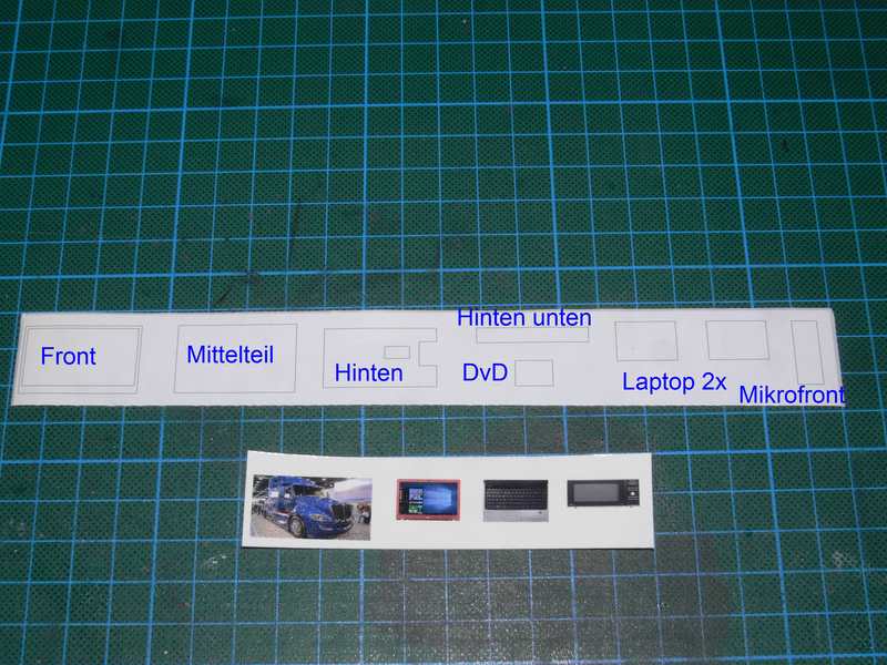 Als erstes habe ich mir mal ein paar original Größen besorgt und die dann passend umgerechnet, bzw. für die Mikrowelle auf die Größe des Faches im rechten Schrank angepasst. Für den Fernseher, musste mein Eigener herhalten. Die Teile dafür habe ich dann wieder am PC gezeichnet und auf Etikettenfolie ausgedruckt und auf einen Reststreifen Sheet geklebt. Dabei sind dann auch gleich die Decals für alle Teile entstanden.