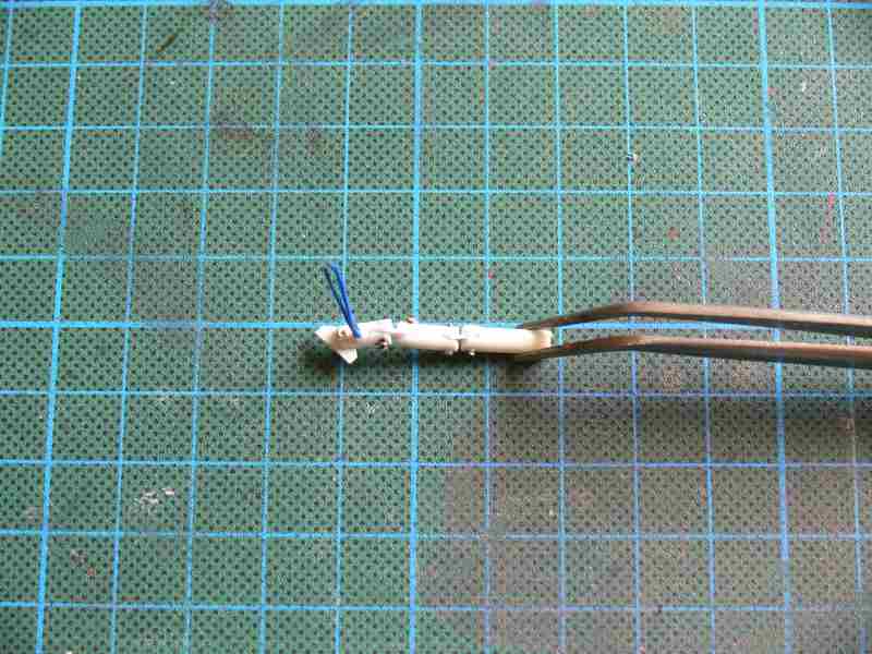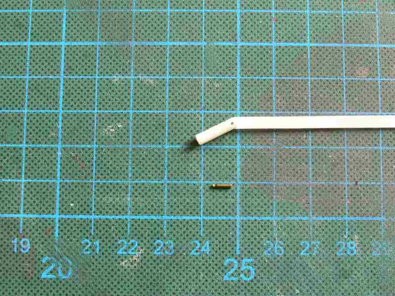 Dann habe ich mir von einem anderen 0,5mm Sheetrest, einen 3mm breiten Streifen abgeschnitten, an einem Ende abgerundet und in das erste Halterungsteil eingesteckt. Nun ein 1mm Loch durch gebohrt und einen ca. 3,5mm langes Messingstück zum befestigen eingesetzt.