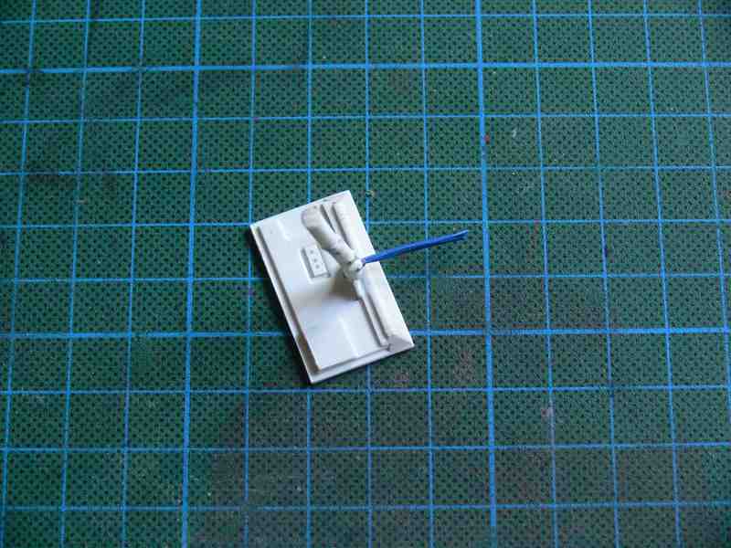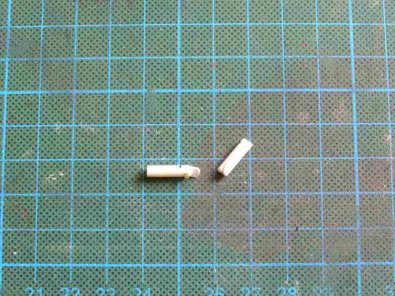 Allerdings erschienen mir diese Bolzen, auf Dauer gesehen, nicht stabil genug und ich habe dann aus 0,75mm Sheet, neue kleine Platten gemacht und mit einer 4mm Bohrung versehen. Die Bolzen wurden dann leicht überstehend eingeklebt, wenn das alles fest ist werden die Platten noch abgerundet, damit es später nirgendwo dagegen stoßen kann.
