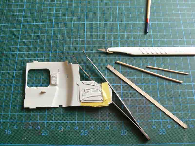 Die Türverkleidungen an den Seitenteilen waren zuerst an der Reihe, hier auch mal zu sehen, die kleinen Hilfsmittel, die ich mir dazu gebastelt habe, um das Tape gut in die Kanten und Rundungen, etc. drücken zu können.