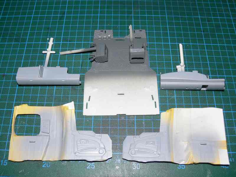 Diese Bereich an den Seitenteilen, sowie die Schränke wurden dann mit hellgrau sm 374 lackiert, im Anschluss daran wurden noch die Sitzgestelle und der vordere Bereich, des Kabinenbodens, mit grau sm 378 lackiert.