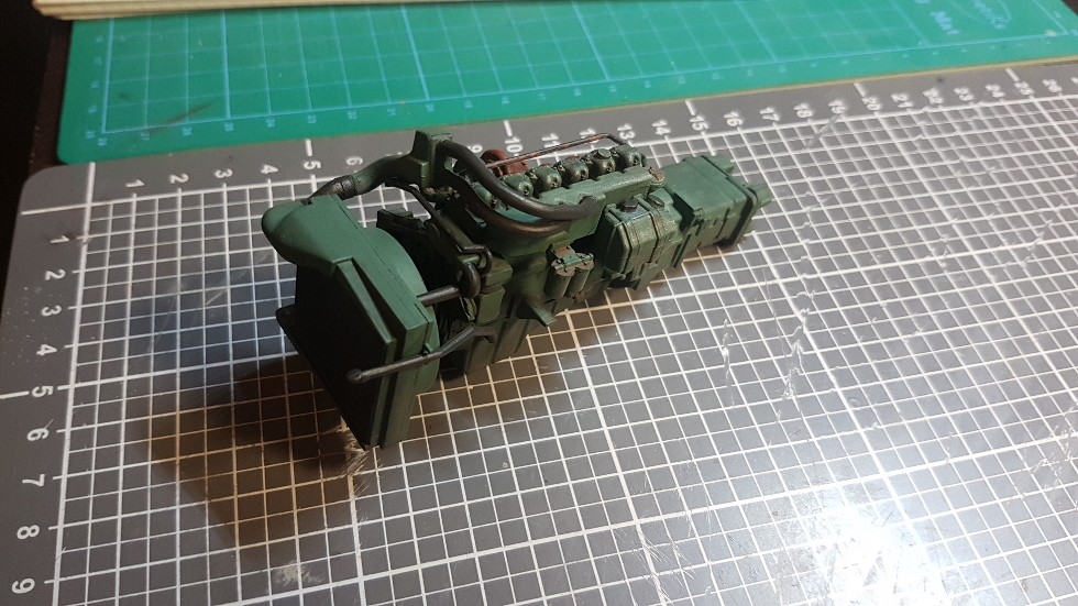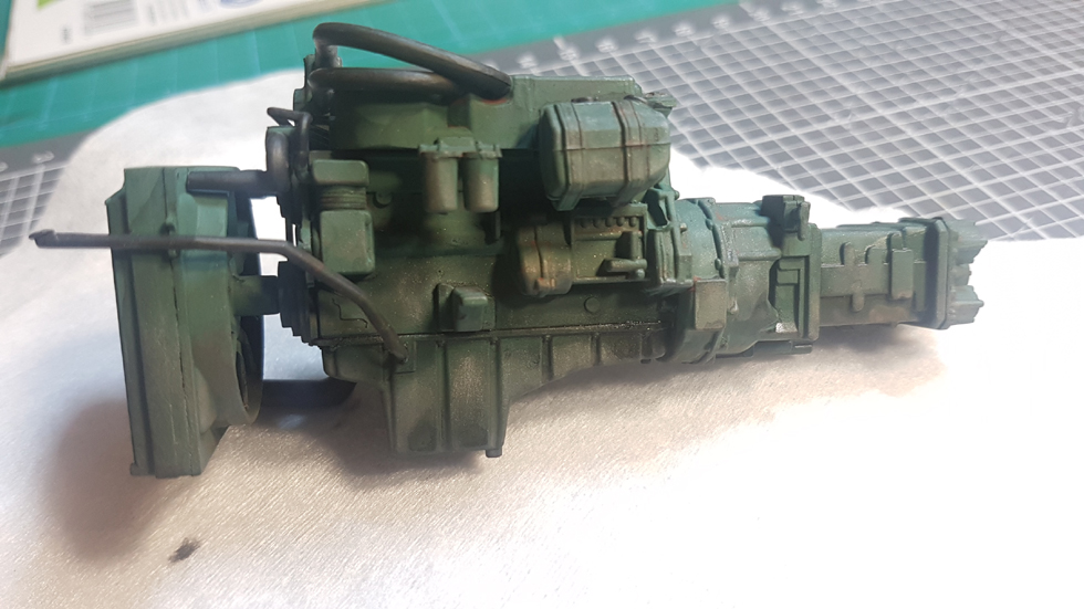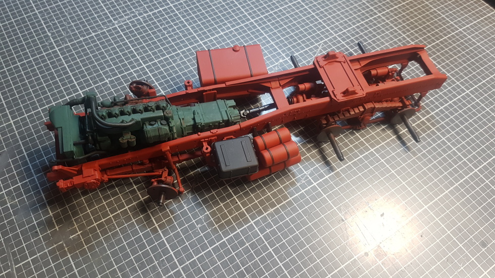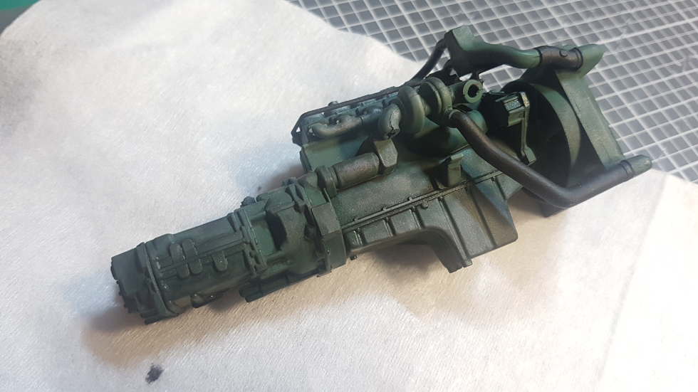 Motor und Rahmen haben eine (zwei) Schichten matten Vallejo-Klarlack bekommen. Der Motor ist damit fertig, der Rahmen geht jetzt in die Detail-Lackierung.