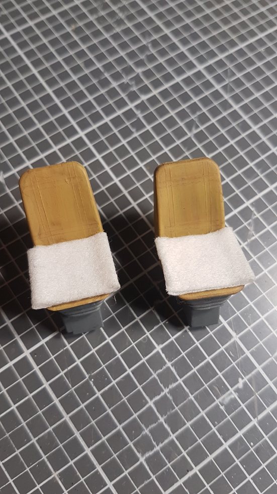 Sitzauflagen. Ein Streifen Feuchttuch mit Leim-Wasser-Mischung getränkt und in Sitzbreite gefaltet: