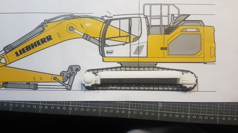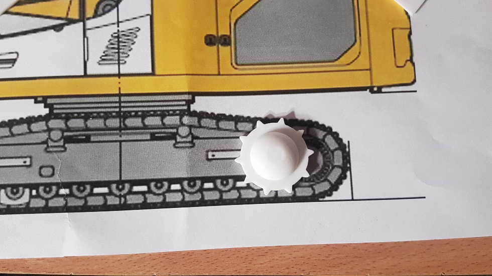 Ich habe mir vor einer Weile mal einen maßstäblichen Ausdruck von einem Bagger gemacht. Nur als grober Anhalt für die Dimensionen. Darauf habe ich gestern mal ein paar Kettenteile und das Antriebsrad gelegt: