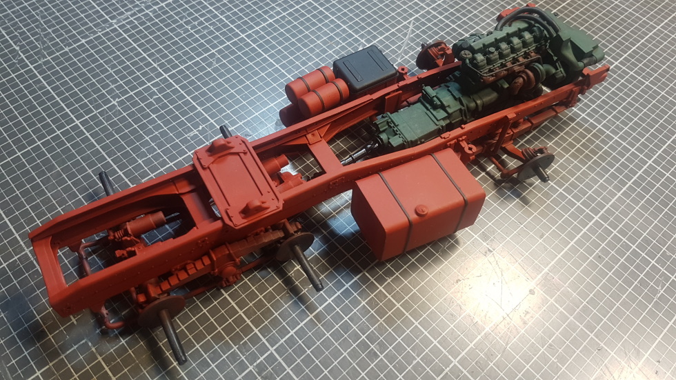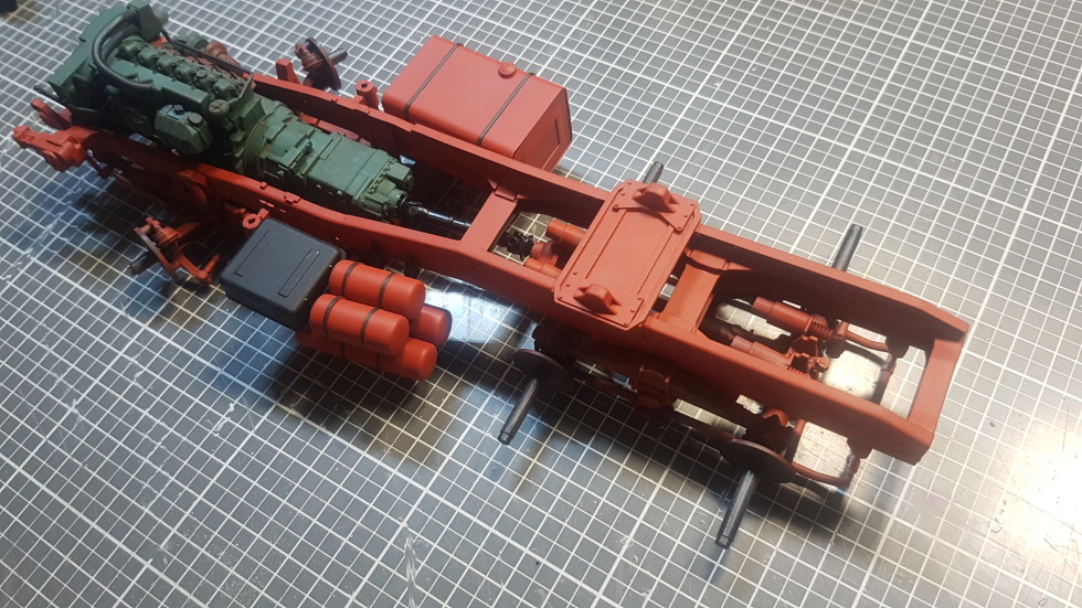 Als erstes wurden die Anbauteile, ein wenig aufgehübscht, der Batteriekasten nach gearbeitet und dann alles an den Rahmen geklebt. Anschließend den Motor zusammen mit dem noch fehlenden Stück Kardanwelle einkleben. Jetzt sieht es so aus: