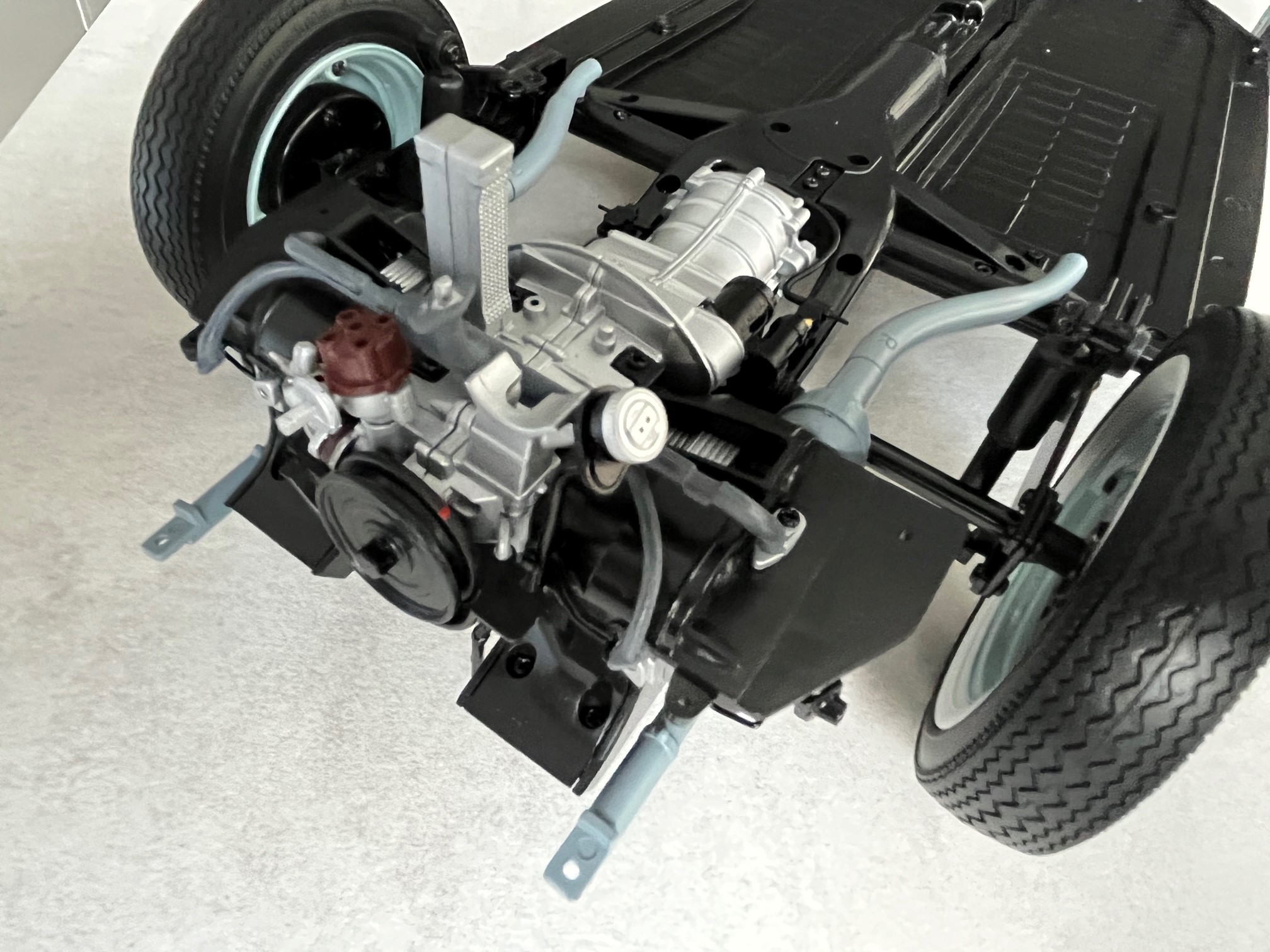 Bodenplatte, die vier Räder sehr zeitnah heraus bringen, die Achsen und Teile der Lenkung. Ist das geschehen, kann man den Wagen von unten her aufbauen. Es ist immer gut, wenn das Fahrgestell auf