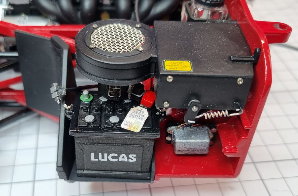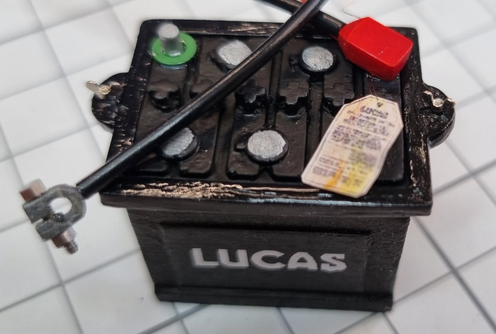 Ich habe mir jetzt eine Resinbatterie gekauft, den Halterahmen aus Sheet nachgebaut, die Polklemmen ergänzt und ein LUCAS Typenschild aufgeklebt.