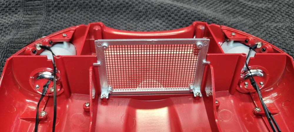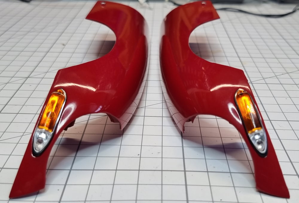 Nun werden die Kotflügel mit den Scheinwerfern an der Haube befestigt.