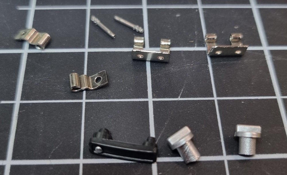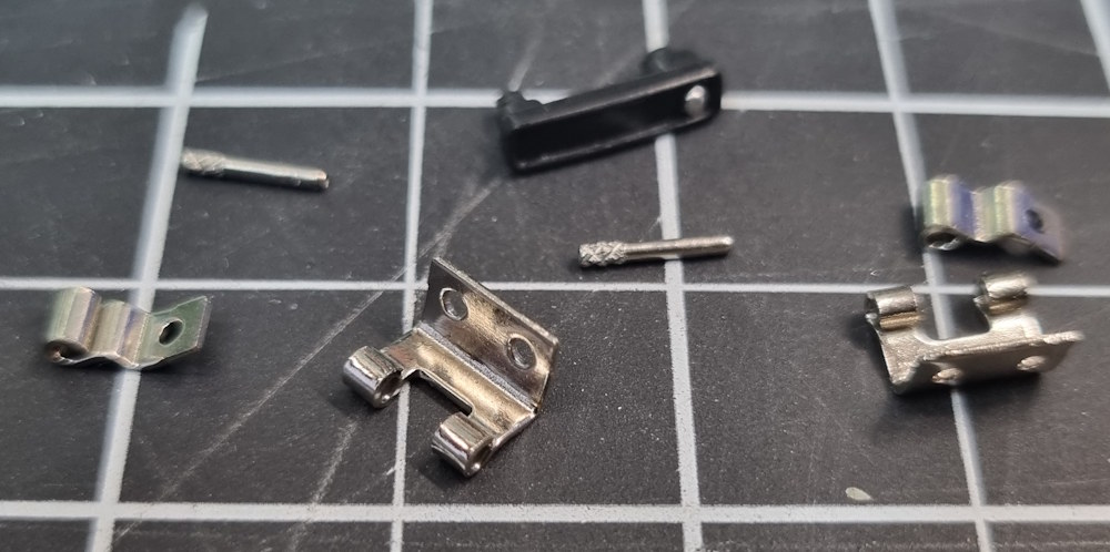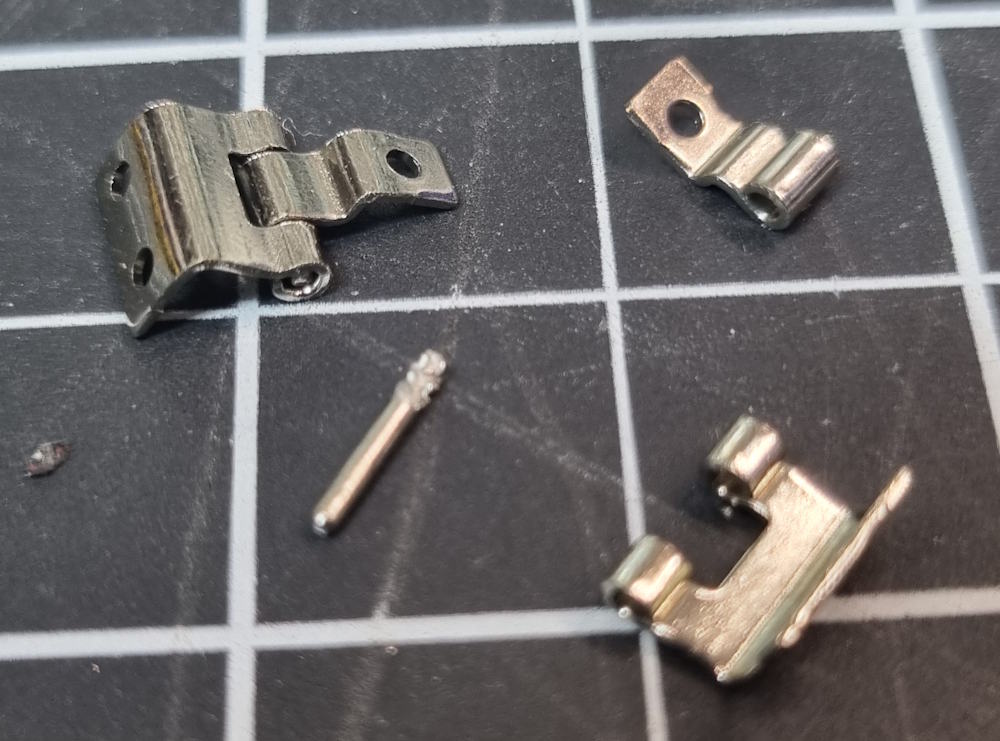 Jetzt werden die winzigen Scharniere zusammengebaut, hier ist nur zu beachten das der Stift auf einer Seite geriffelt ist um in der Scharnieröse festen halt zu haben.