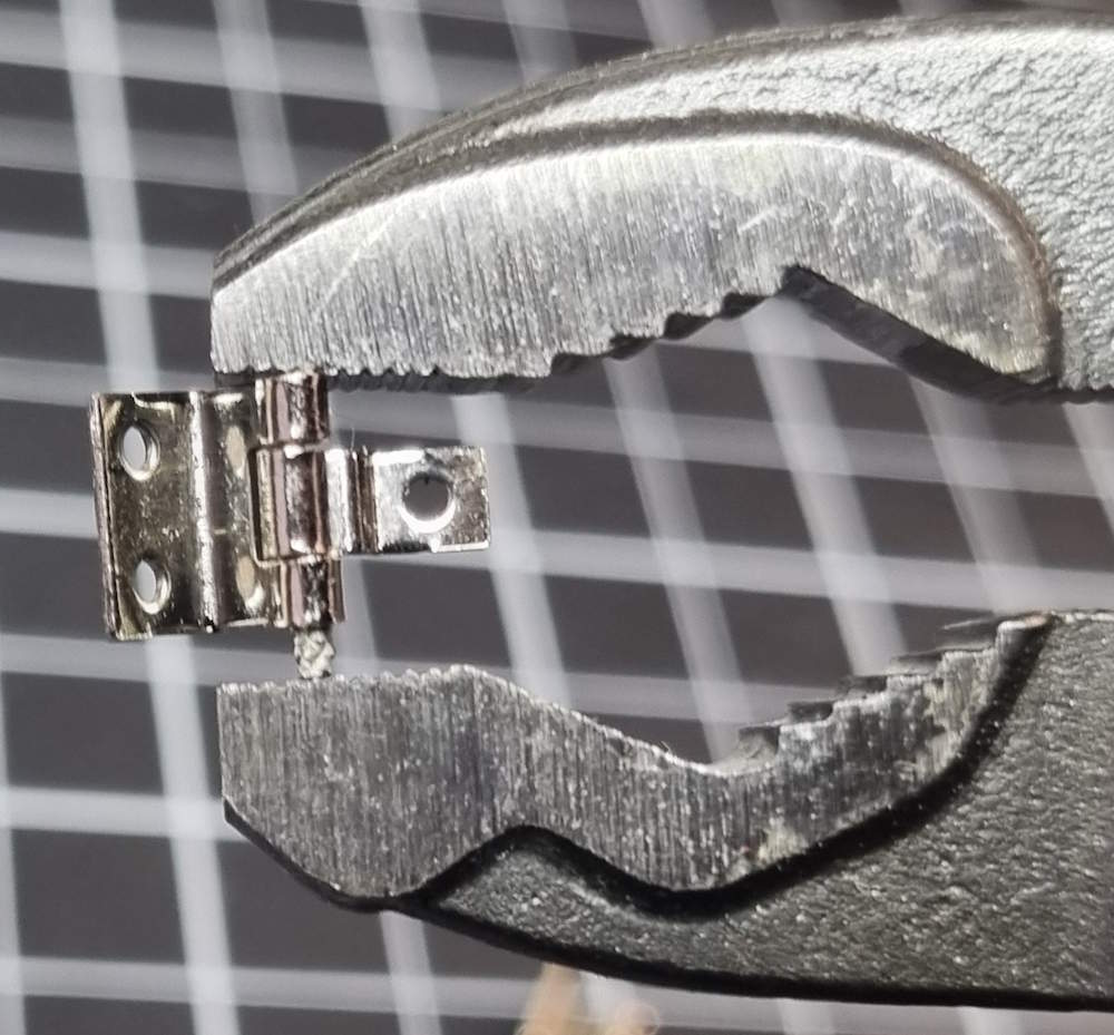 Die Scharniere werden vorsichtig zusammengesteckt und mit einer Zange wird der Stift vorsichtig vollständig eingedrückt.