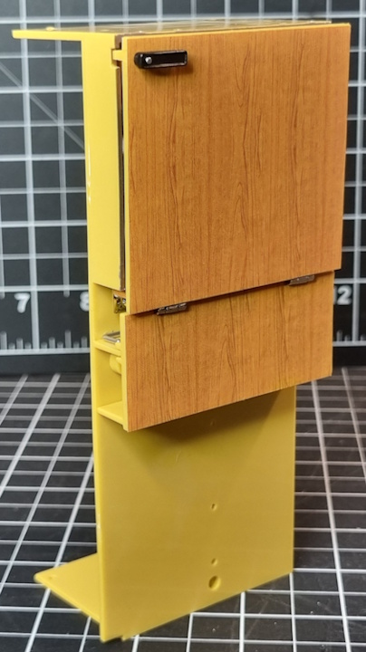 Viel gibt auch hier nicht zu berichten, Aufkleber aufbringen, Scharniere zusammenbauen nun an der Tür montieren, Griff aufstecken und fertig ist der Bau für diesen Monat.