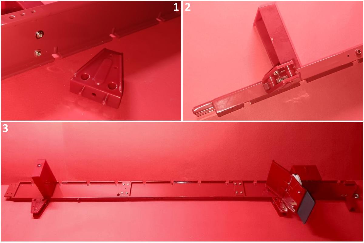Als nächstes kümmern wir uns um den zweiten Querträger von hinten. Zuerst werden die beiden seitlichen Halterungen mit jeweils einer Schraube an dem Querträger befestigt ( Bild 1 bis 3 ). Danach können wir diesen auch am rechten Längsträger anbringen. Dazu schieben wir den Querträger zwischen die beiden Auflagen ( Bild 4 – weißer Pfeile ). Danach können wir verschrauben.