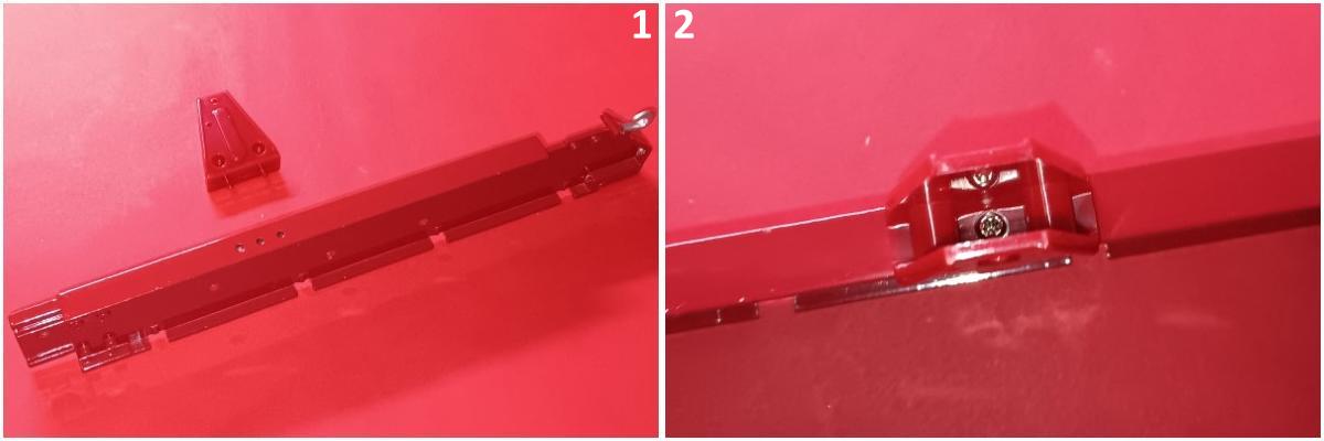 Danach befassen wir uns mit dem Staukasten ( Bild 1 ). Der Deckel wird von vorn eingesteckt und anschließend von hinten mit zwei Schrauben befestigt ( Bild 2 + 3 ). Der Kasten soll auf der Außenseite des Längsträgers angebracht werden ( Bild 4 ).