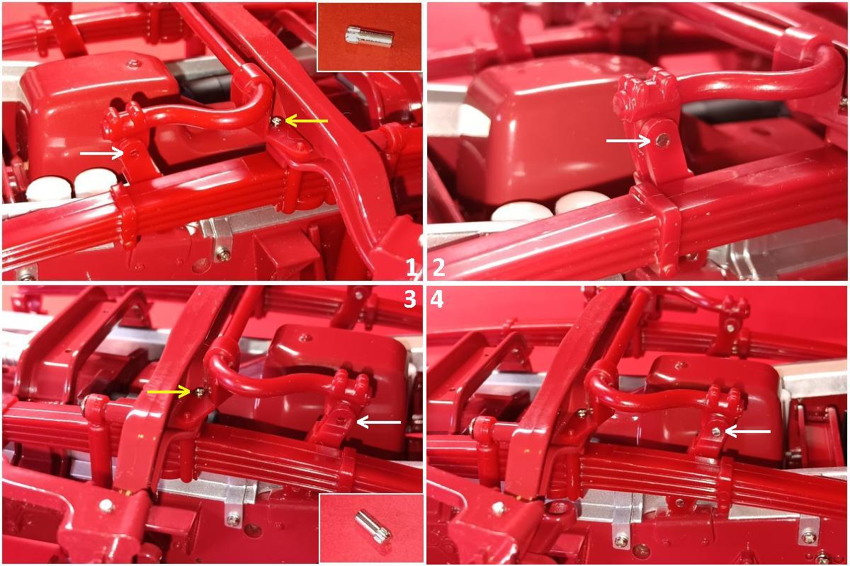 Der Achsträger wird aufgelegt und jeweils mit einer Schraube an den Blattfederpaketen verschraubt ( Bild 1 – gelbe Pfeile ). Wir nehmen uns nun eine der beiden Kolbenstangen dazu. Diese wird mit einer Schraube am Achsträger verschraubt ( Bild 1 – weiße Pfeile + Bild 2 ). Danach drehen wir das Chassis so, dass wir die linke Seite vor uns haben. Dort bringen wir die zweite Kolbenstange in Position und verschrauben diese ( Bild 3 + 4 ).