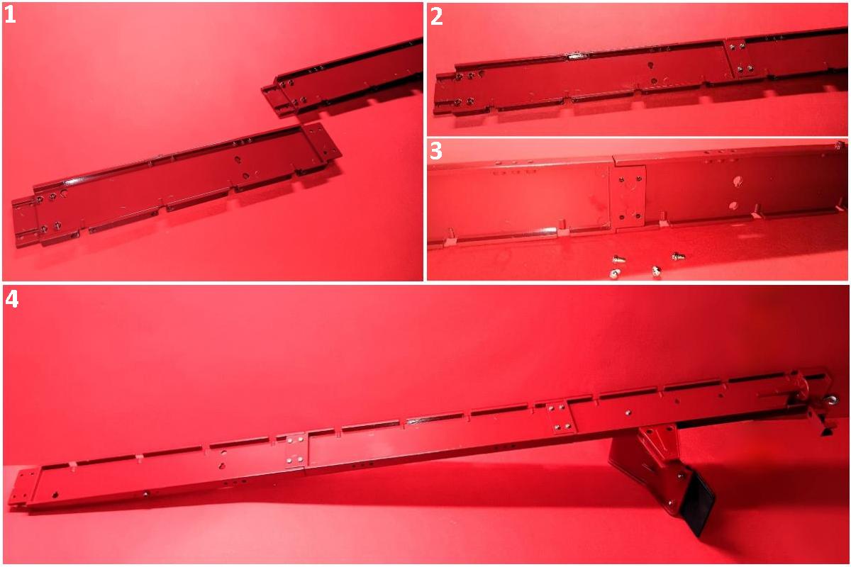 Jetzt habe ich alle Längsträger zu einem Teil zusammengesetzt und von außen vierfach verschraubt ( Bild 1 + 2 ). Nun kam der Moment, an dem ich bemerkt habe, dass die Verschraubung auch auf der Innenseite zu erfolgen hat ( Bild 3 ). Okay, das war schnell nachgeholt. Jeweils die vier Schrauben eingedreht und alles scheinbar korrekt ( Bild 4 ). Aber nur scheinbar!