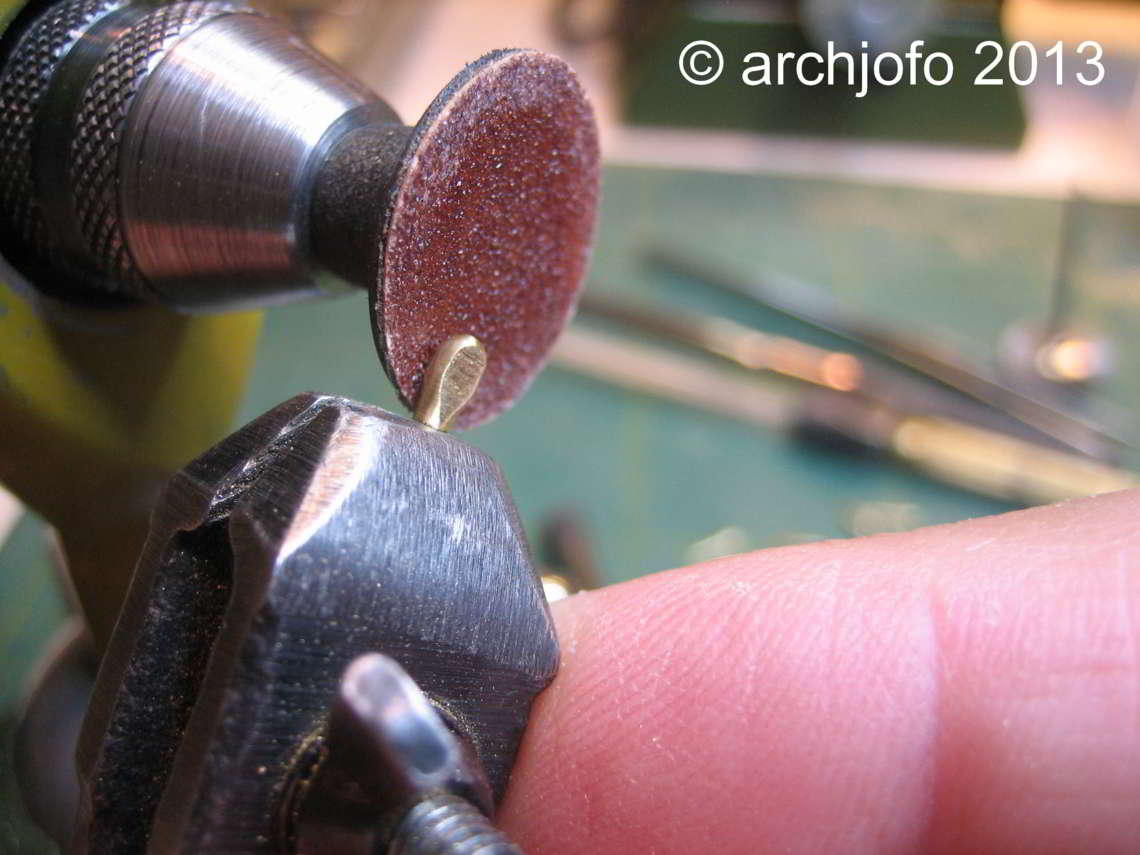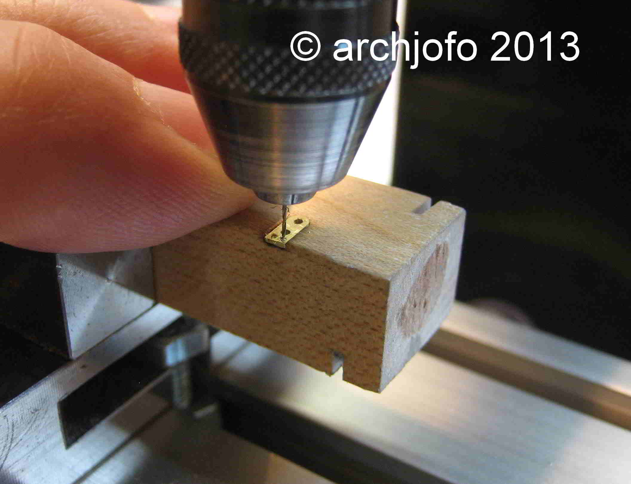 Im nächsten Schritt sind dann die Laschen ( 4,6 mm/2 mm) mit den erforderlichen Bohrungen ( 2 x Ø 0,8 mm und 2 x Ø 0,3 mm) zu versehen. Insbesondere stellte sich die Herstellung der Bohrlöcher mit Ø 0,3 mm als nicht ganz einfach dar.