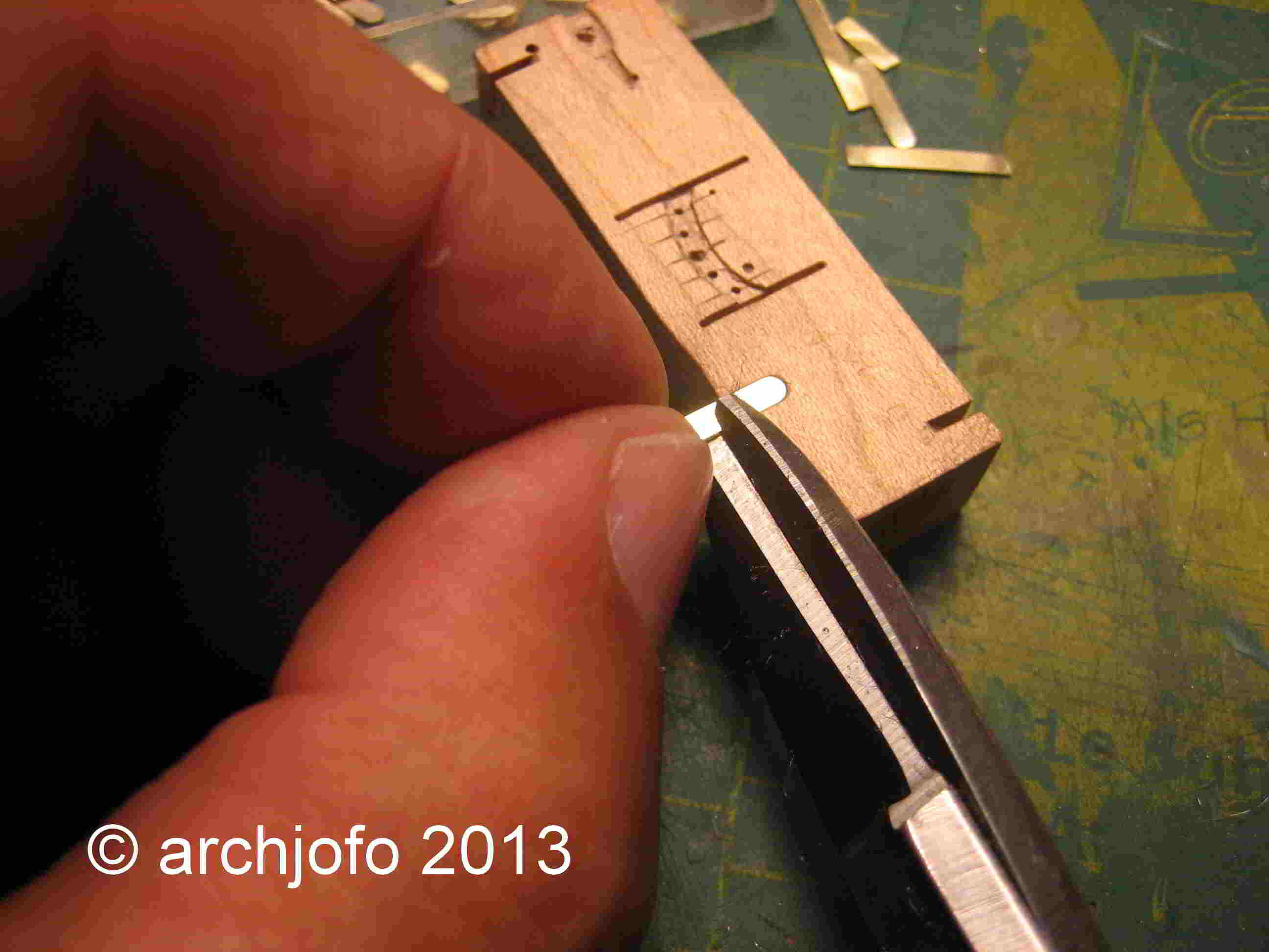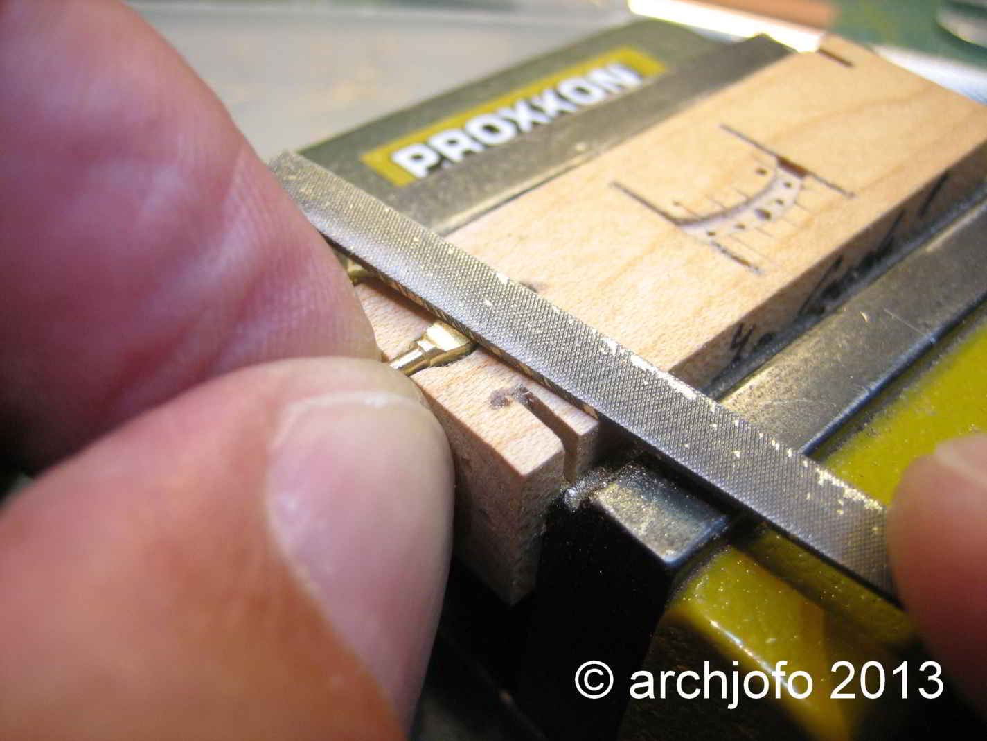Die obere Abrundung dieser Laschen wurde komfortabel an einem Streifenstück vorgenommen und anschließend mit einer Ablänghilfe zugeschnitten und die Kante exakt abgefeilt, wie auf den nachfolgenden Bildern zu sehen ist.