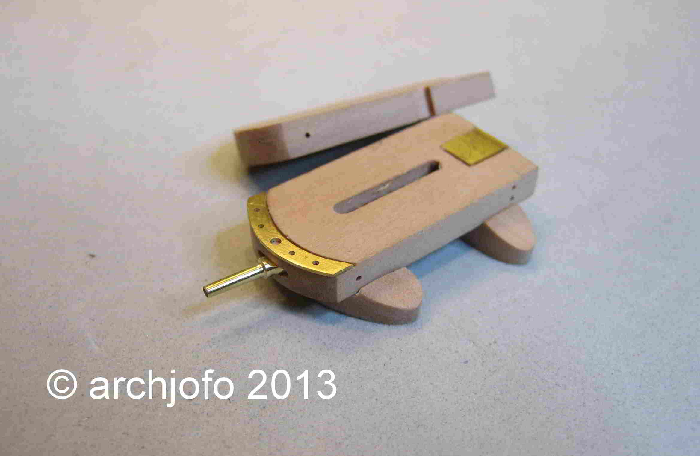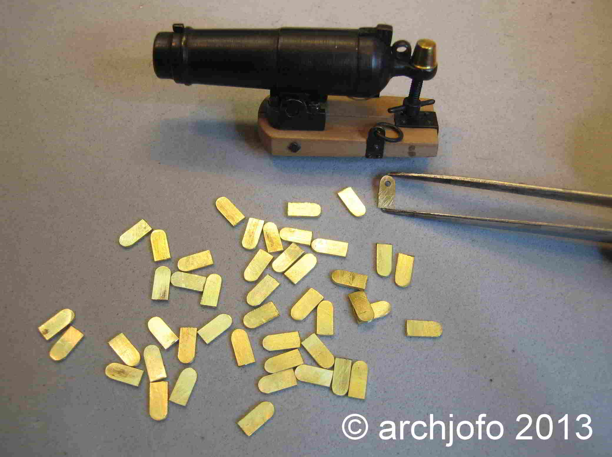 Entsprechend der bereits an den Gleitschlitten vorgenommenen Ausfräsungen werden diese Laschen aus 2 mm breiten Messingblechstreifen (0,5 mm Dicke) hergestellt.