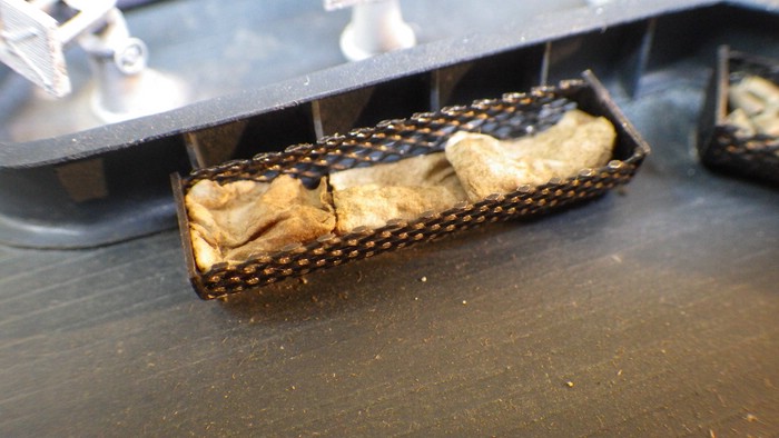 nach langem Überlegen habe ich heute eine Methode ersonnen, um die Körbe mit den "Rettungsmitteln" zu füllen. Man nehme ein 2 mm dickes Polystrolrohr und schneide davon ca 4 mm lange Stücke zurecht, anschließend Epoxid Spachtelmasse anrühren und mit schwarzer Farbe auf Wasserbasis einfärben. Selbige in eine Spritze füllen und den Korb zu dreiviertel befüllen. Jetzt in die klebrige Masse die Polystücke einbetten, hellgrau streichen und anschließend weiß, schwarz und erdfarben weathern. Wie das am Schluß dann aussieht zeigen die Bilder...
