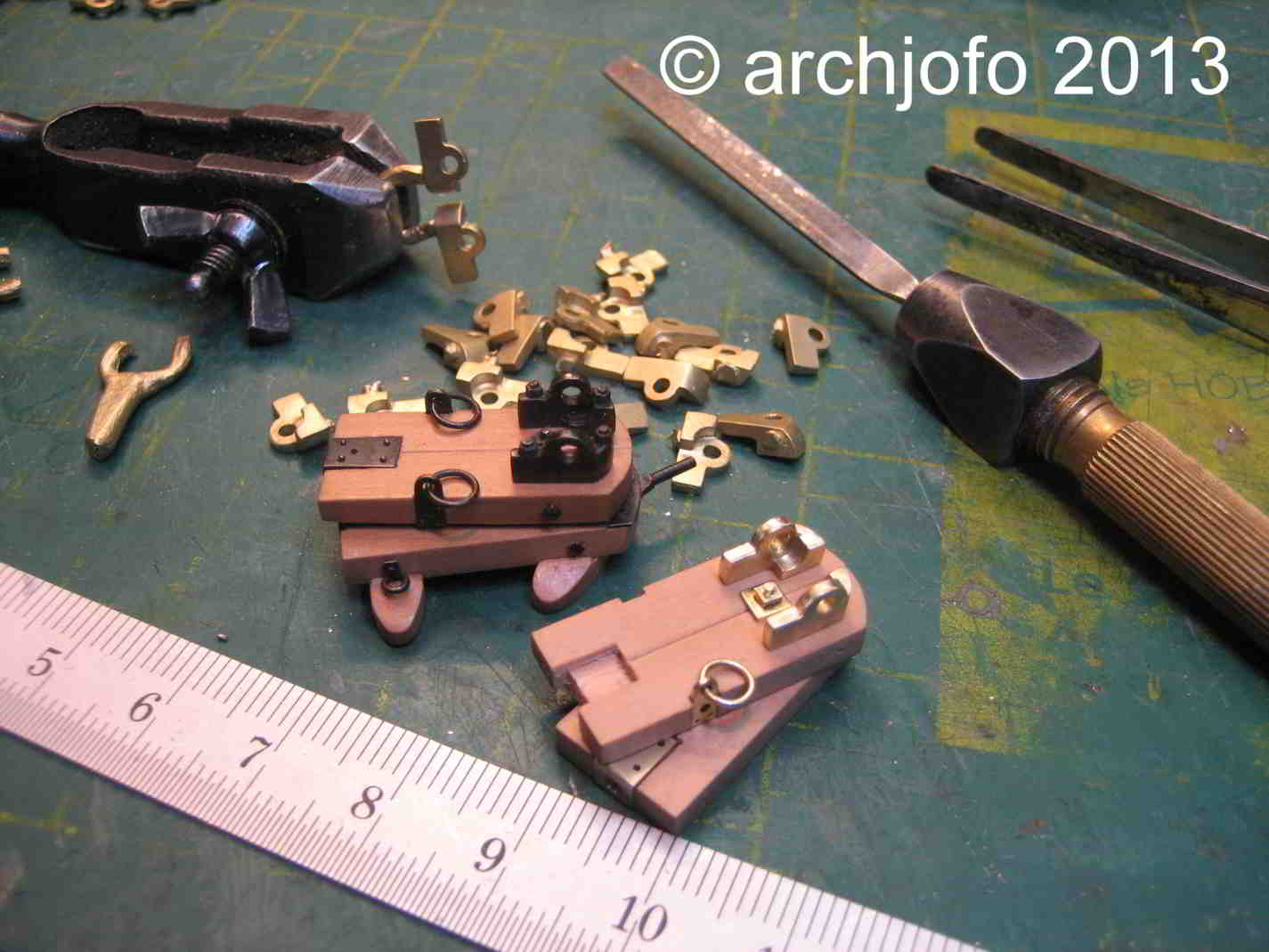 So wie z. B. gestern, als ich die ersten Rohrlager der Carronaden mit Bohrungen Ø 0,8 mm versehen wollte. In diese Bohrlöcher werden dann die Schrauben (Maulweite 1 mm) eingelötet. Diese stellen die Verschraubung der Rohrlager mit dem oberen Gleitschlitten der Lafette dar.