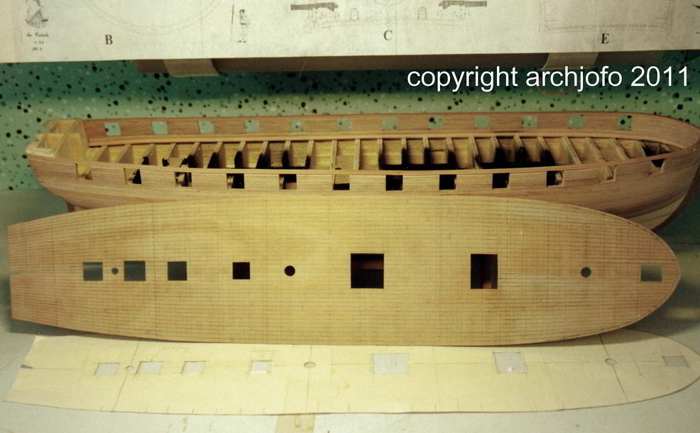 Das Gute bei der La Creole ist, dass die Originalwerftpläne auf der Seitenansicht die Rumpfblankenbreite eindeutig zeigen. Bei der Decksbeplankung habe ich mich auf die Planunterlagen