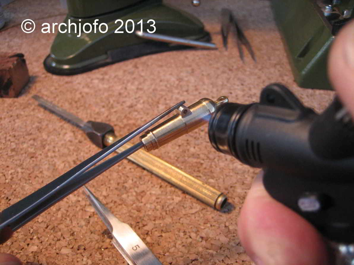 Wie bereits angekündigt löte ich zur Vervollständigung der Carronadenrohre noch die Auflagerflansche, die beim Original an das Rohr angegossen waren, mit einem kleinen Gasbrenner in die dafür vorgesehenen Ausfräsungen ein.
