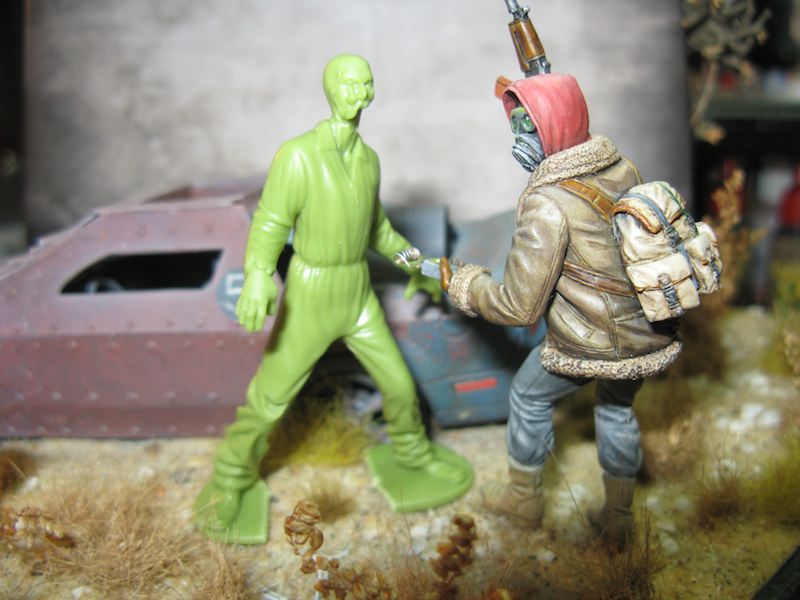 Ein wenig besser passt es mit 54mm-Figuren (wie zum Beispiel meinem Stalker):
