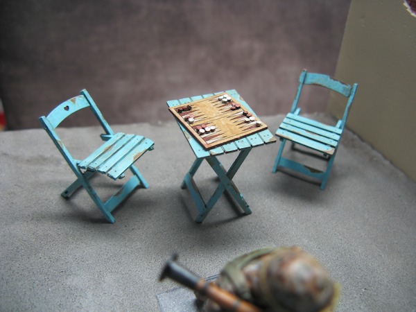 Auf der Dachterasse des linken Gebäudes wollte ich noch eine Sitzgelegenheit für ein oder zwei Wachen aufbauen - mglw. mit Sonnenschirm...