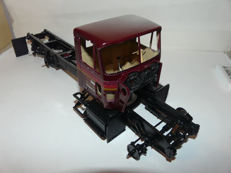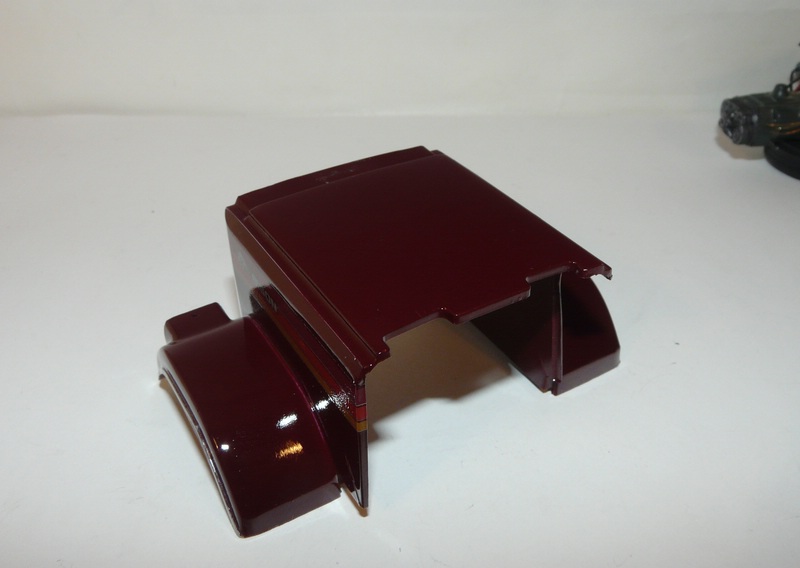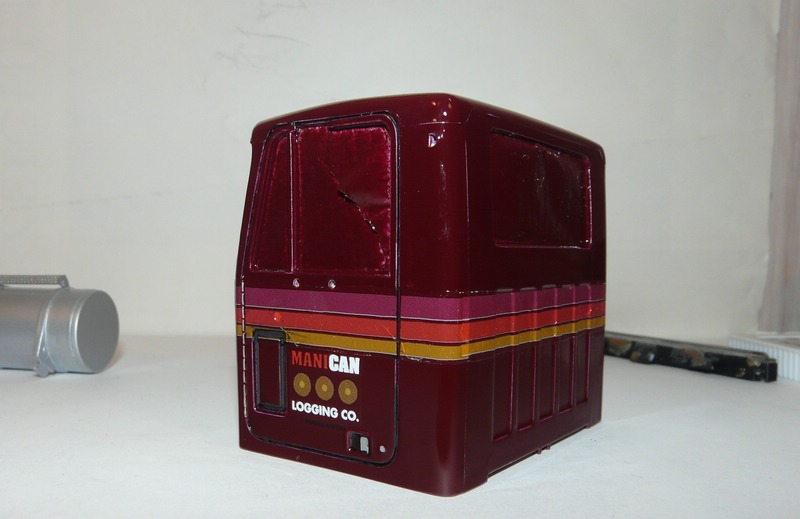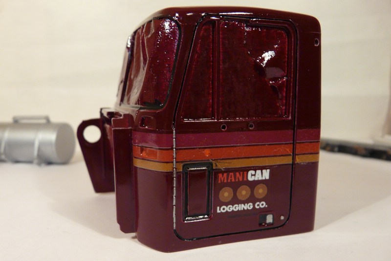 So, soviel dazu, ich war aber auch sonst ein bißchen fleißig. Die Kabine und die Haube haben ihre Decals bekommten, Diichtungsgummis und die Schaniere "versilbert" und dann wurden sie geklarlackt. Haube ist noch nicht ganz fertig, Kabine zeig ich Euch aber schon mal. Die Decals sind leider ziemlich alt und bröselig, an ein paar Stellen dann auch ausgefranst, aber ich denke es geht. Die Firmenlogos sind allerdings aus dem Decalbogen des Trailers und deutlich besser, weil neuer. Aber jetzt schaut selbst....