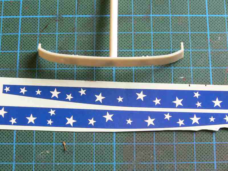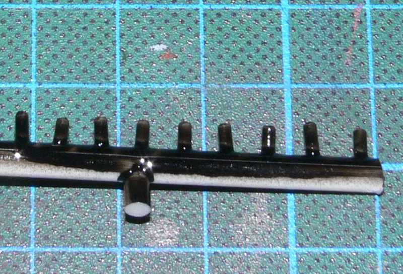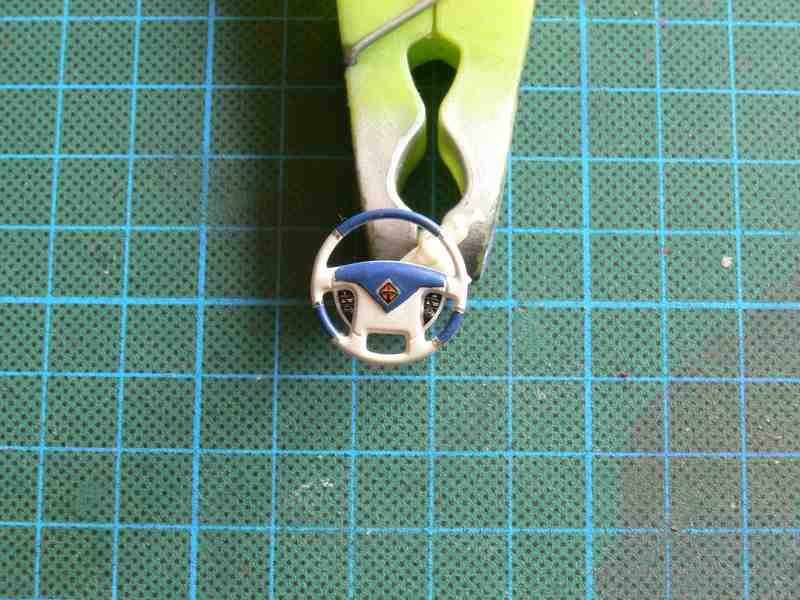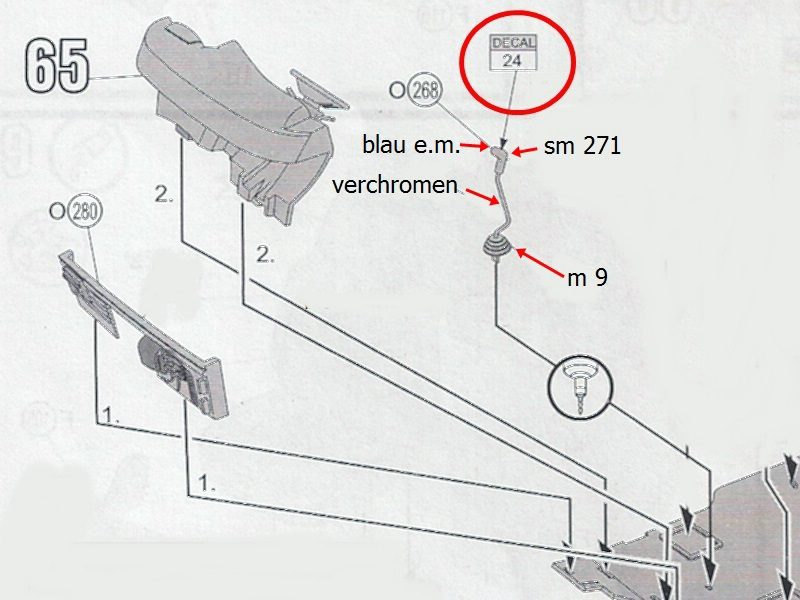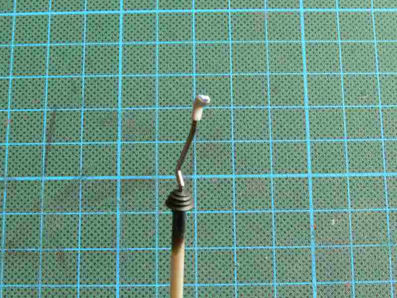 Gegen Mittag war dann der Schalthebel soweit trocken, das der Gummiwulst, unten, mit Anthrazit matt 9 lackiert wurde und der Schaltknauf, oben, wurde mit lichtgrau sm 271 lackiert, später kam da noch ein Tupfen von meiner blauen Mischung mit drauf und dann wurde noch das Decal angebracht.