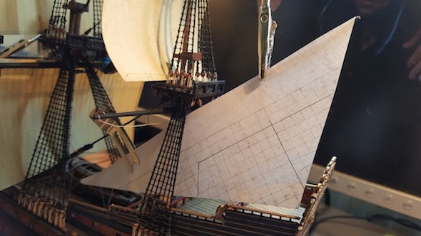 Ein weiterer Versuch aus zwei Schichten sollte direkt an der Rahe trocknen und teilgerefft sein.
