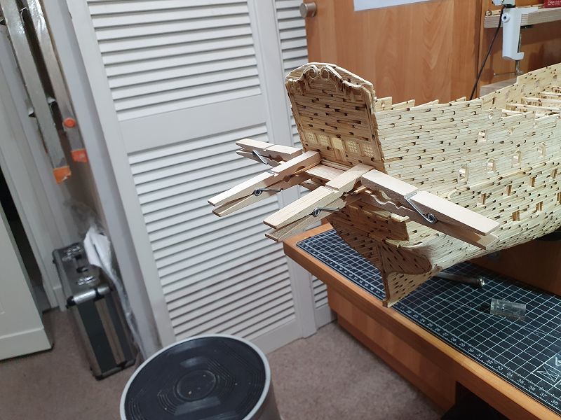 Am Schiff habe ich nun zuerst mal die andere Seite bis zum mittleren Balkon beplankt und den obersten Balkon gebaut.