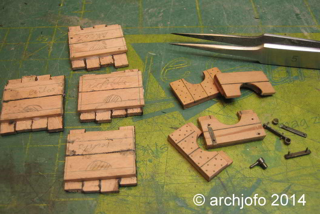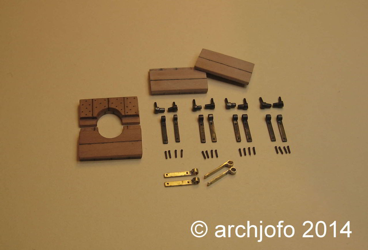 Auf dem folgenden Foto sind die letzten Beschlagteile dafür abgebildet sowie zwei Deckelpaare. Eines davon bereits für die Montage soweit fertiggestellt. Bei dem anderen fehlt noch die Bohrung für die Geschützrohrdurchführung.