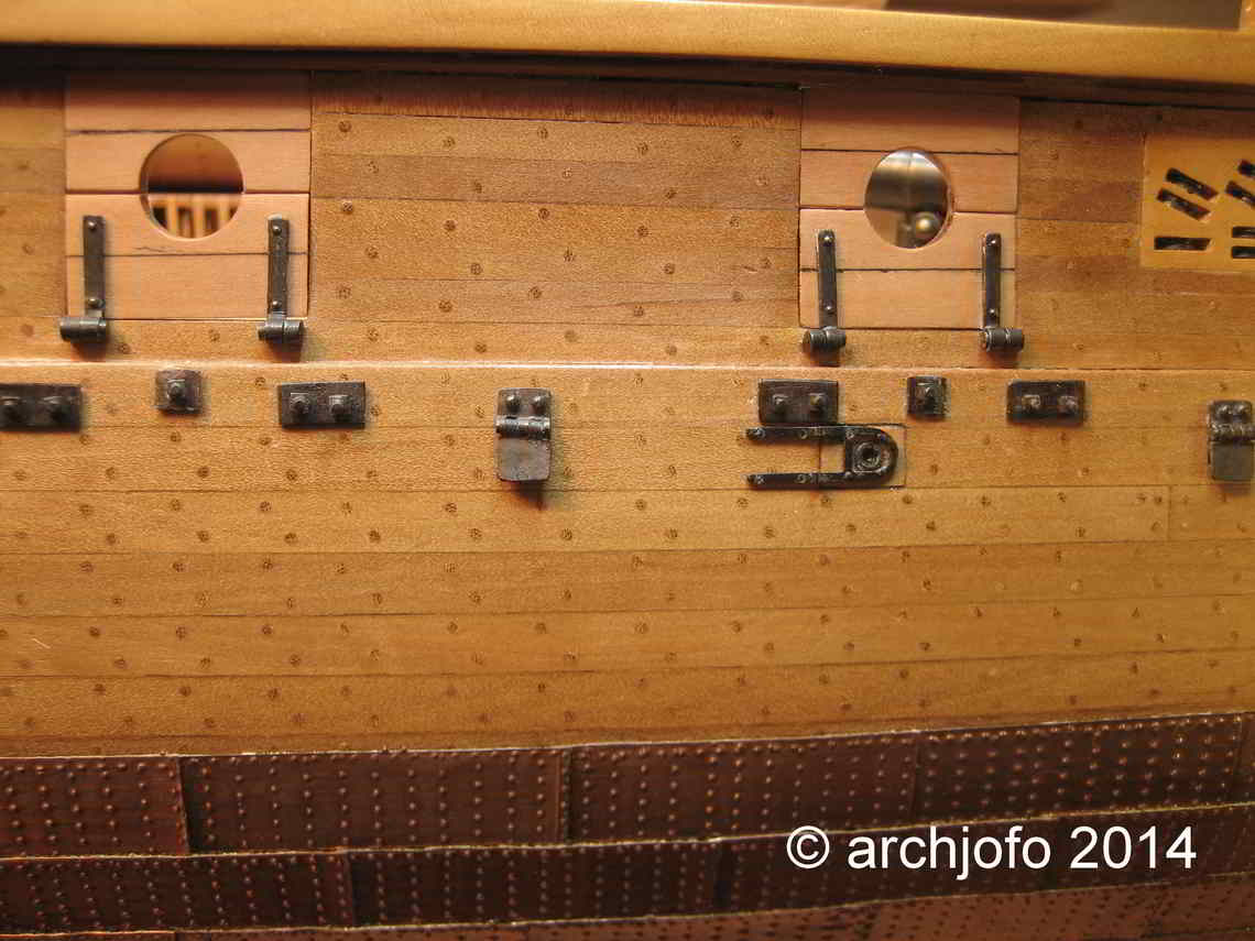 Mich beschäftigt jedoch immer wieder die Frage, ob ich doch noch die Befestigung der oberen Stückpfortendeckel mittels Haken und Ösen nachbilden soll. Vielleicht wage ich einen Versuch?