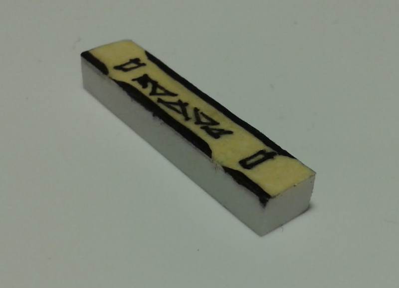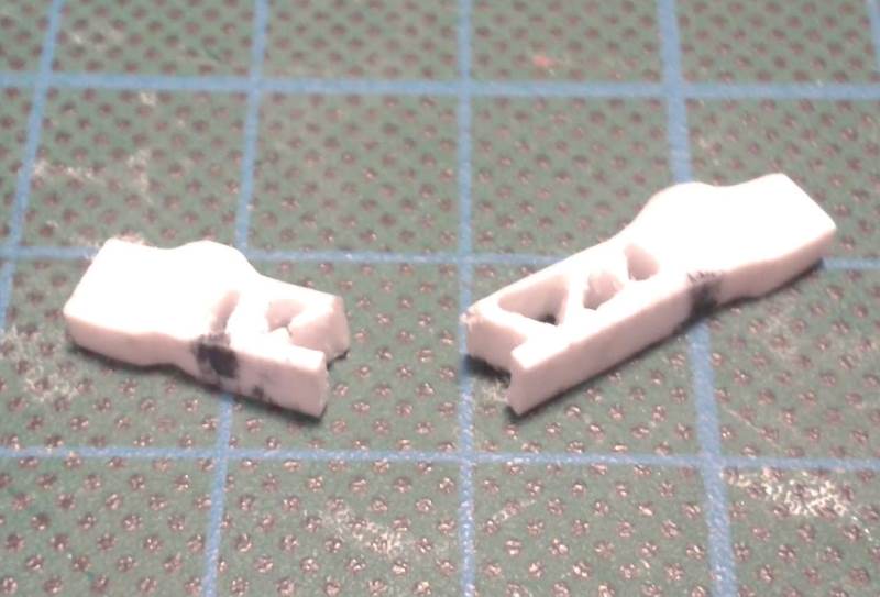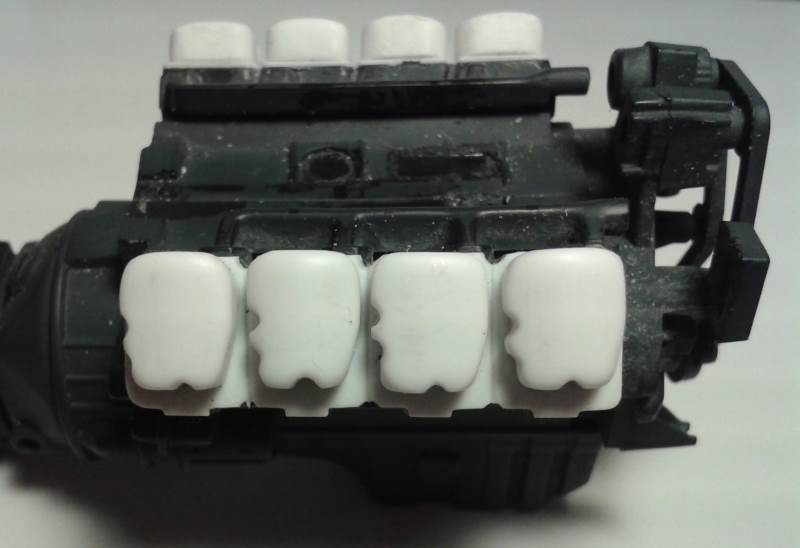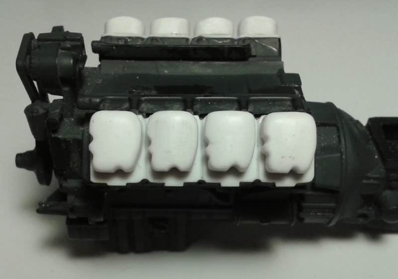 Die neuen Zylinderköpfe wurden aus einer 4mm PS-Platte gefertigt. Erst wurde ein länglicher, 7mm breiter Streifen abgeschnitten und dann in 8 Stücke mit 9mm Länge aufgeteilt. Sprich LxBxH 9mm x 7mm x 4mm. Dann wurden die Ecken abgerundet und an der Oberseite eine Rundung geschliffen. Danach wurde rechts die Schräge und die rundlichen Aussparungen gefeilt. Zum Schluss wurden dann alle scharfen Kanten abgerundet. Anschließend konnten die fertigen Köpfe an den Motorblock geklebt werden. Das Ganze sieht dann so aus:
