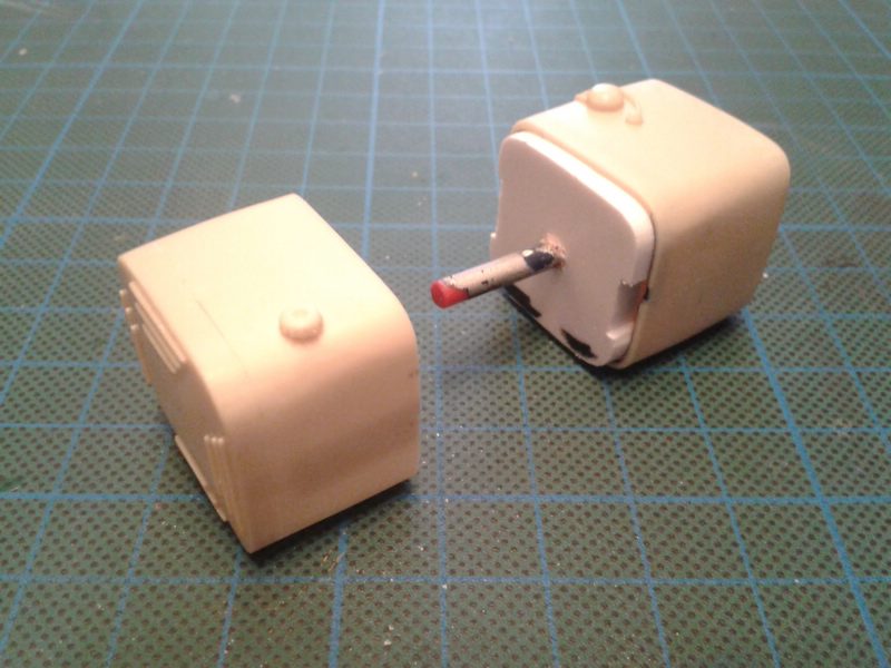 Der Kraftstofftank für die Beifahrerseite entstand aus einem gekauften Resin-Scaniatank. Der Resintank wurde zuerst zusammengebaut, um dann in der Mitte ein Stück herauszuschneiden. Um mehr Fläche beim Kleben zu haben und um den Tank überhaupt kleben zu können habe ich ein Einsatzstück gebaut. Somit konnte ich die beiden Hälften gut zusammenstecken und anschließend zusammenkleben.