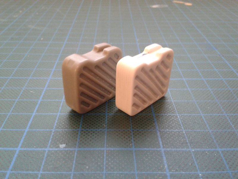 Und die Teile. Links oben, die gelben sind die Abgüsse, rechts unten das weiße ist der Master:
