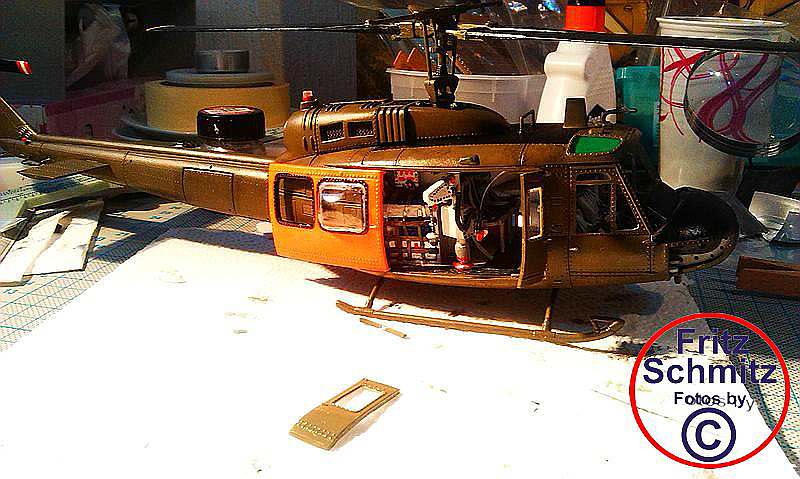 Schade das du den Rumpf Unifarben läst, wenn ich an eine UH-1D SAR denke habe ich sofort das Tarnmuster mit Orangen Türen im Kopf.