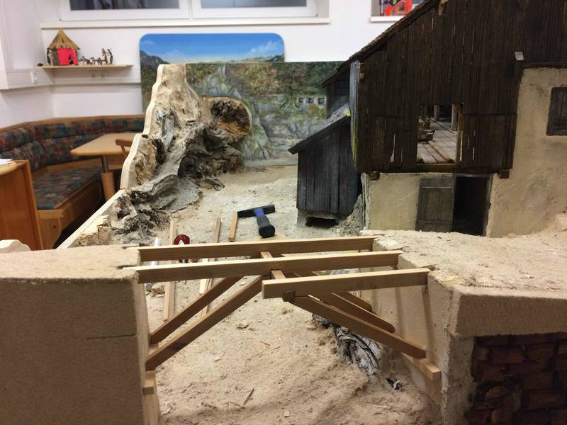 Das Kantholz am Widerlager wird später mit einer Mauer ersetzt. Da sollen dann die Streben auf einem Mauersims aufliegen