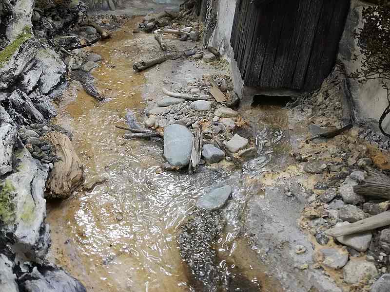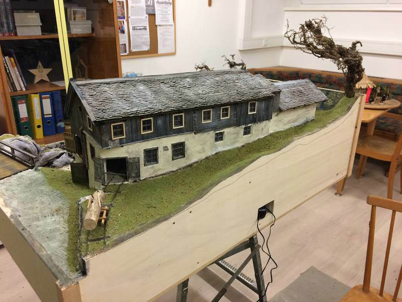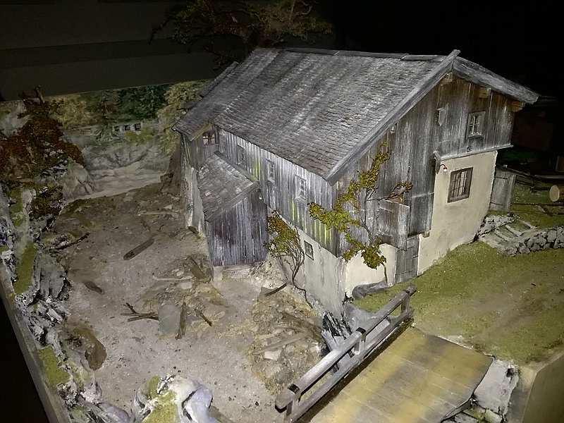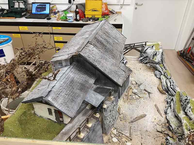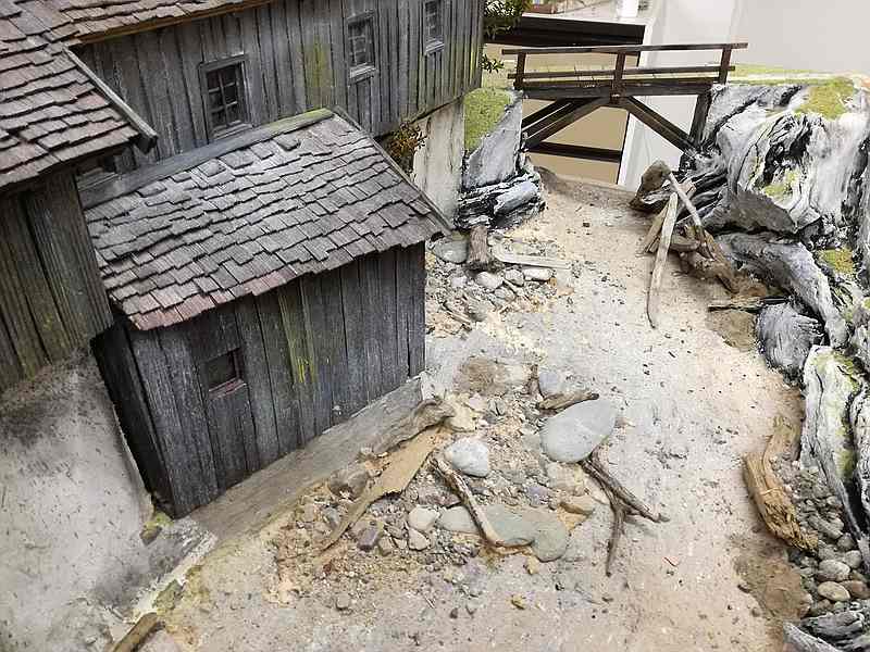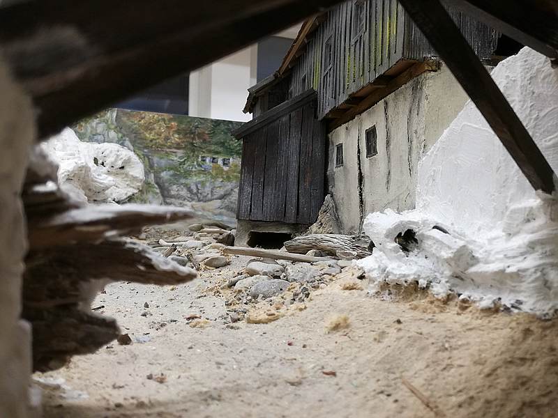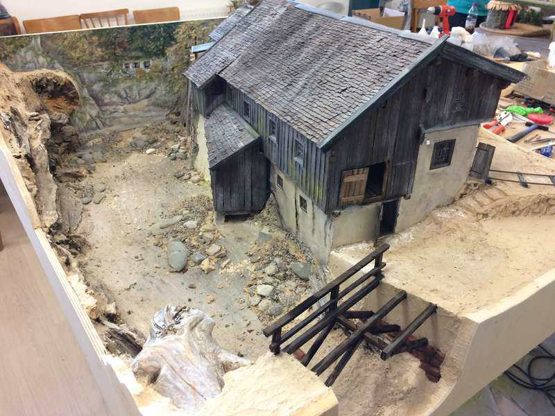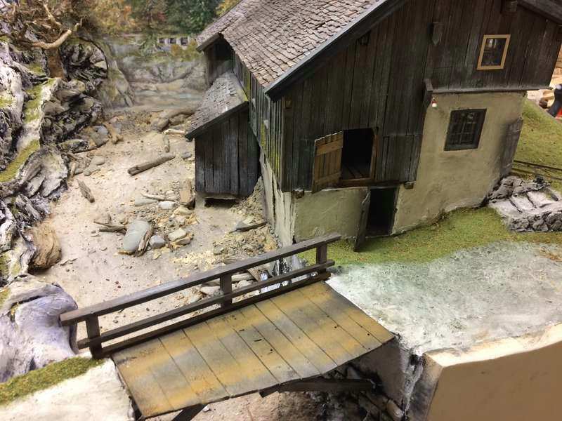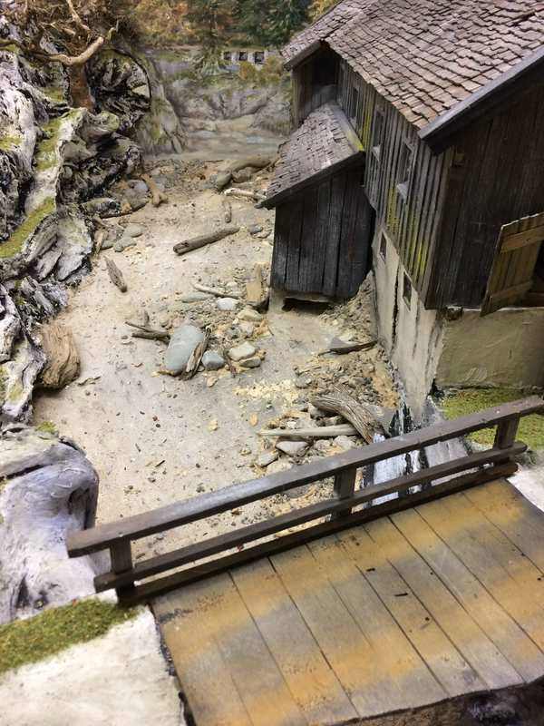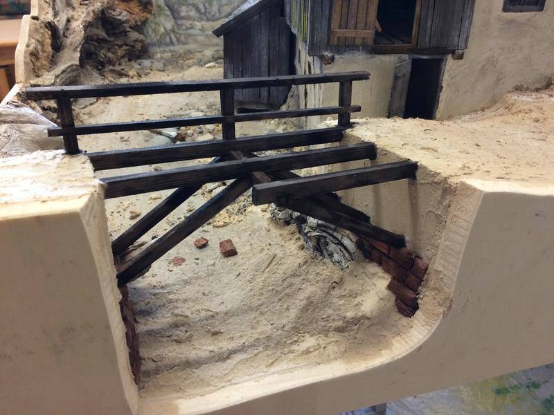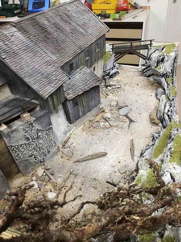 Diese Brücke ist eigentlich nur Phantasie, weil wir kein Foto von der alten Brücke auftreiben konnten und die Neue hätte nicht dazu gepasst. Übrigens: Die Steine im Bachbett habe ich getauscht und stellenweise mit Sand "eingeschwemmt". Dies stimmig zu gestalten dürfte noch komplizierter werden, als ich mir das vorgestellt habe. Das benötigte Treibholz habe ich auch schon gesammelt.