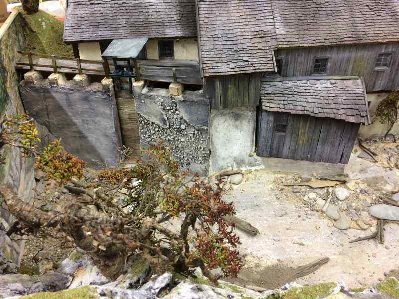 ...die Steinmauer im Vordergrund haben wir dunkelbraun und schwarz bemalt und immer gleich mit dem feuchten Schwamm herausgewischt. Auf den Bildern schaut das aber etwas heller aus, als es tatsächlich ist. Der Baum im Hintergrund stammt von Wurzeltellern umgerissener Bäume. Wobei man hier vor allem darauf achten sollte, dass der Windwurf einige Jahre zurück liegt und der Grund auf dem der Baum stand eher steinig ist. So bekommt man die Wurzeln leichter sauber und man sieht sie auch leichter, weil sie meist schon blank aufragen.(Blöde Beschreibung, aber ich hoffe ihr wisst, was ich meine!).