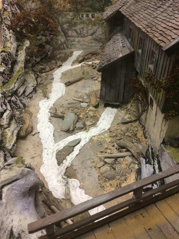 nun haben wir die Lösung für den Bach gefunden! :) Das Strukturgel haben wir noch mit dem Fön angeheizt und nachdem es dann doch etwas glasig wurde haben wir gleich Wasserglas draufgeschüttet und mit dem Fön solange angetrocknet bis es Wellen geschlagen hat und zäh wurde. So haben wir das Wasser in alle "Buchten" geblasen und dabei den leichten Wellengang erreicht.