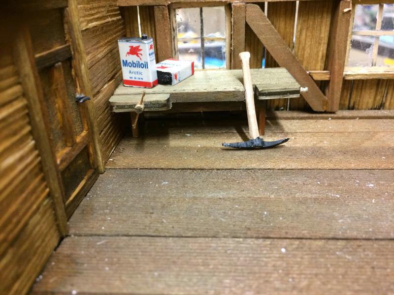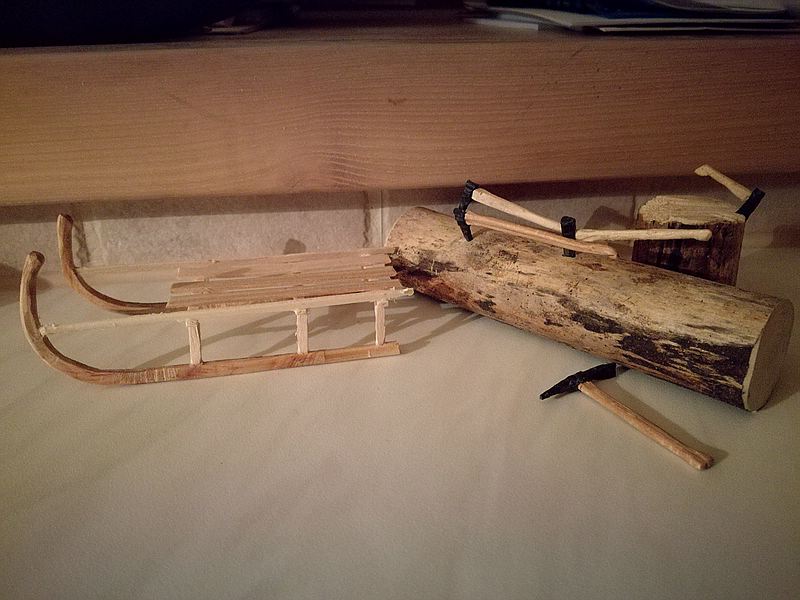 Die Schweller haben wir schon vor einigen Tagen gebeizt, aber was jetzt noch dazu kam ist das Werkzeug auf dem Baumstamm. Den Pickel, Zepin und Spaltbeil habe ich aus Giesästen vom Plastikmodellbau heraus gefräst. An passender Stelle Löcher gebohrt und die Stiele geschnitzt.