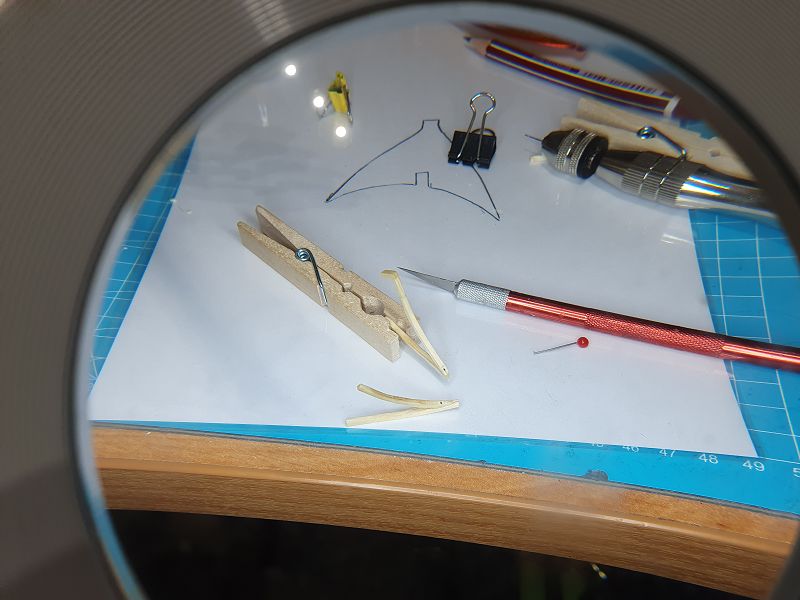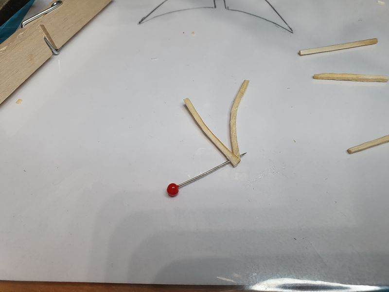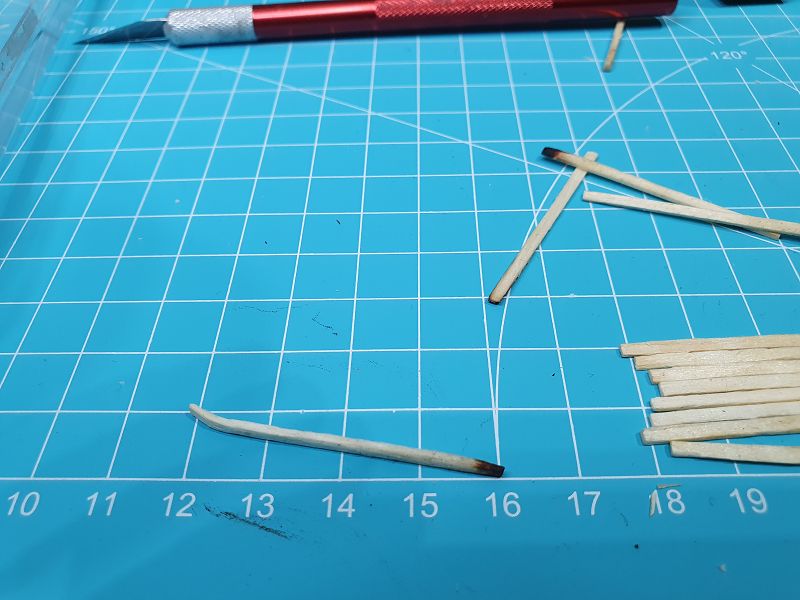 Nach einigen Ausprobieren habe ich mich entschlossen das mit diagonal durchtrennten Streichhölzern zu machen. Also mit Dreieckshölzern.