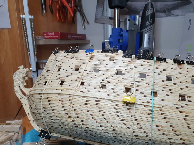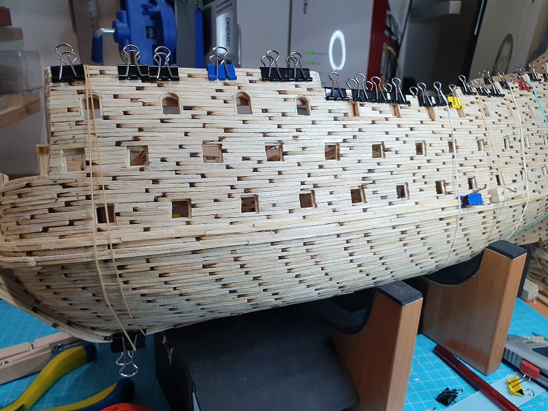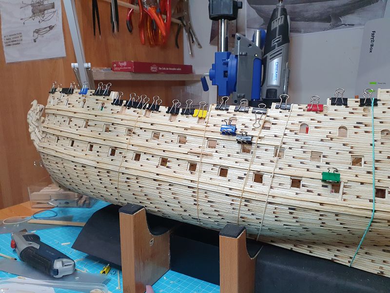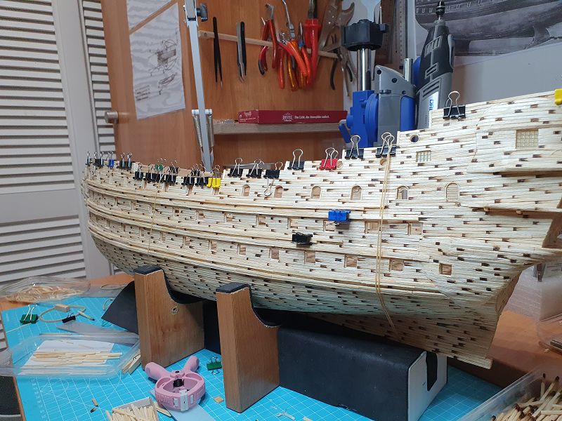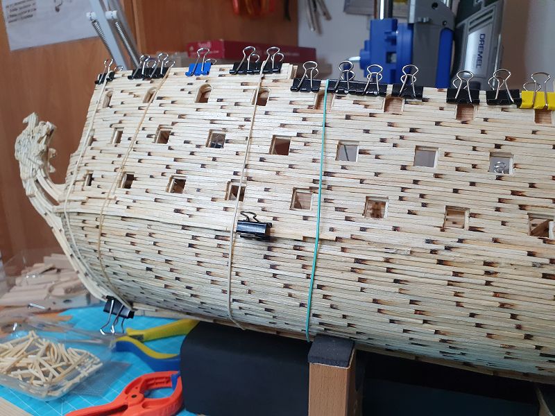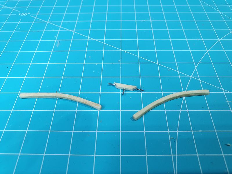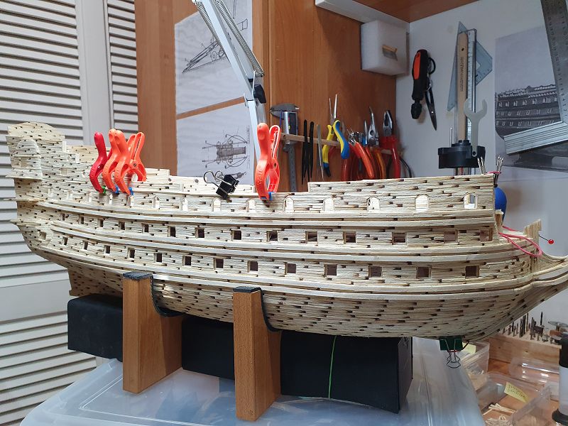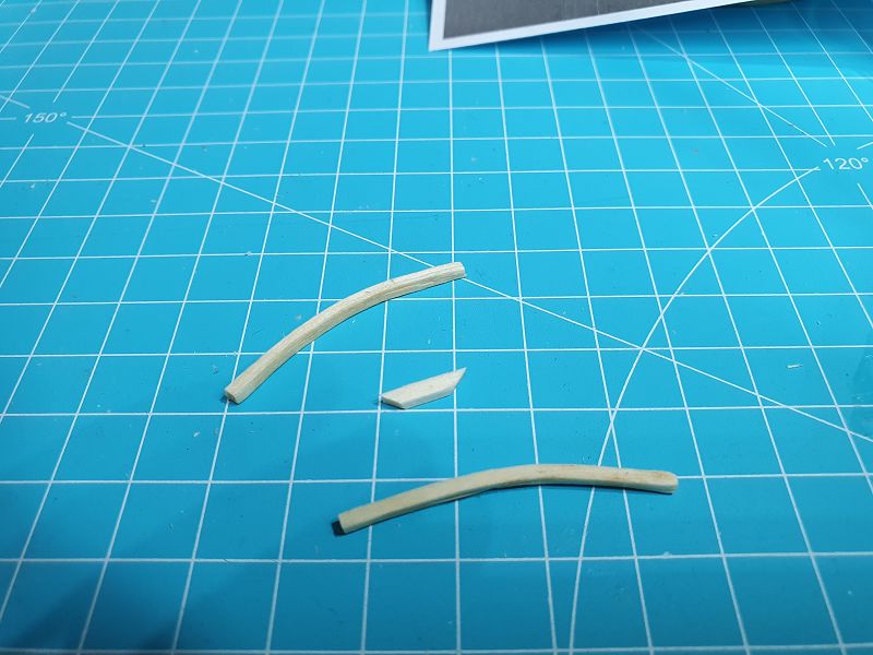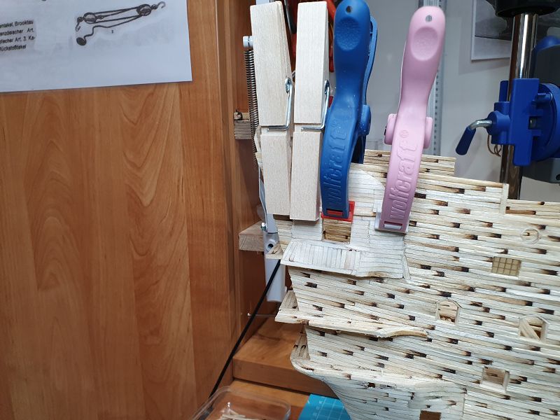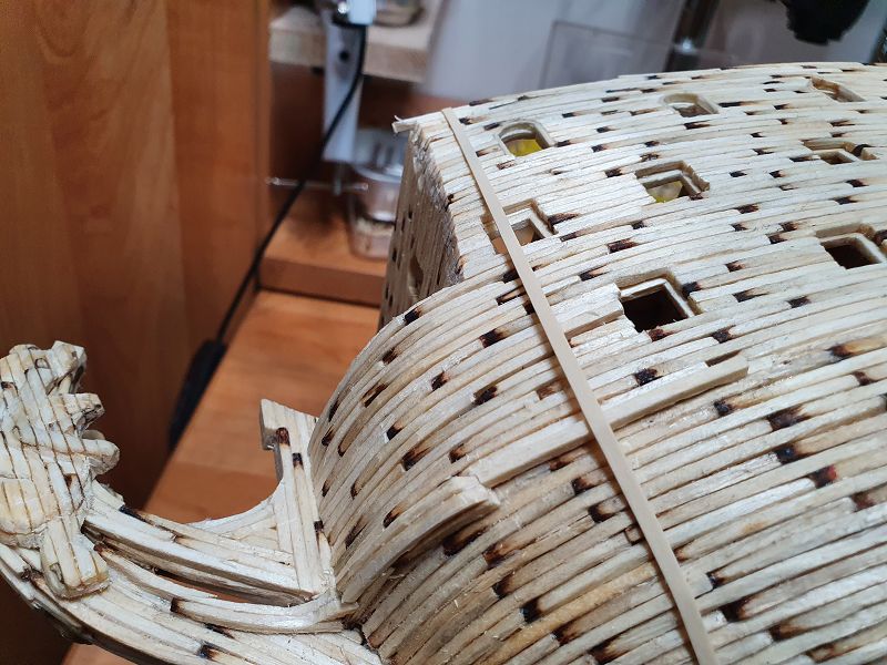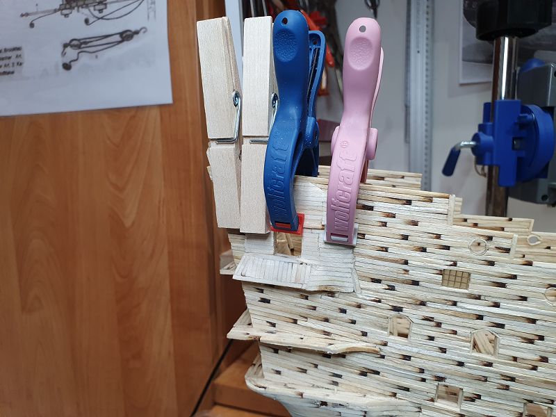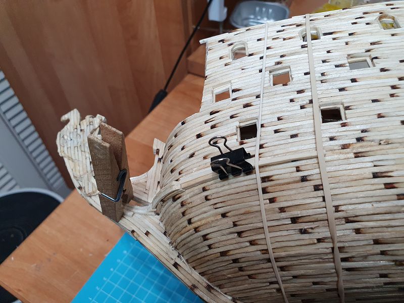 Das Ganze ging natürlich nur sehr langsam da, wenn auch mit Stiften verstärkt, es immer wieder durchtrocknen musste. Also schon eine gute Gelegenheit dabei die ersten Zierhölzer an den Rumpf zu bringen.