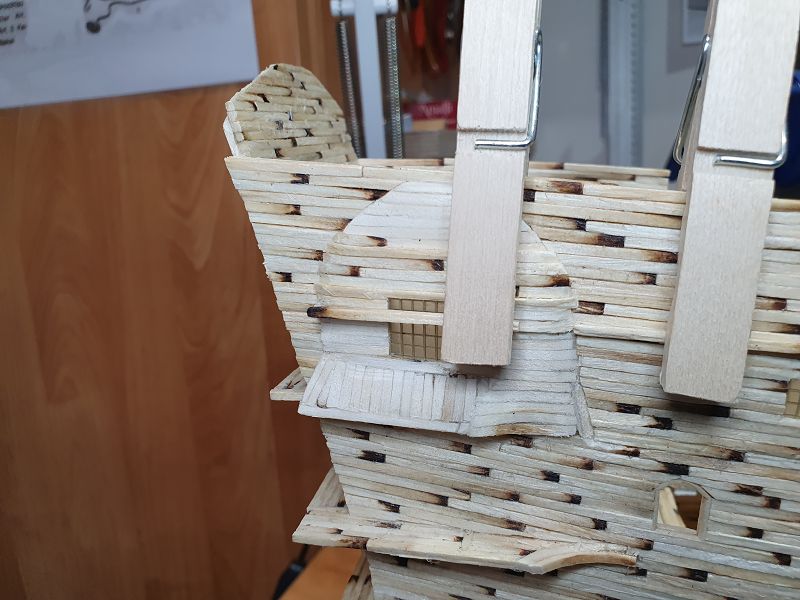 Also weiter mit den Anderen. Etwas doof ist das ich dabei nicht fortlaufend weiter arbeiten kann. Wenn das eine Streichholz gerade angepresst wird kann ich nur sehr vorsichtig in einer anderen Reihe ein nächstes ankleben. Ansonsten verschiebt sich leicht das Erste. Ist eben alles etwas fragil.
