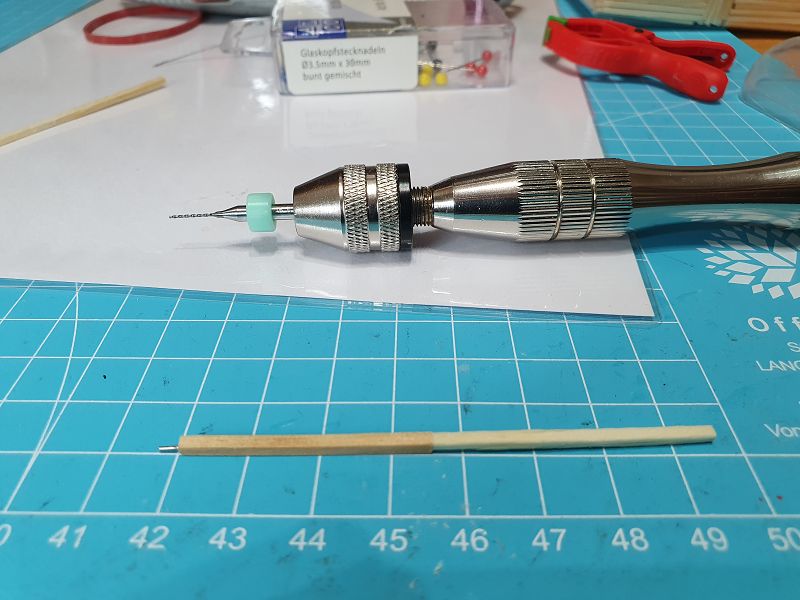 Zuerst mal baute ich den Plankenbieger so um das ich wesentlich kleinere Rundungen herstellen kann. Statt des vorhandenen Aufsatzes habe ich einfach einen 3 mm Bohrer genommen und diesen umgekehrt eingesetzt.