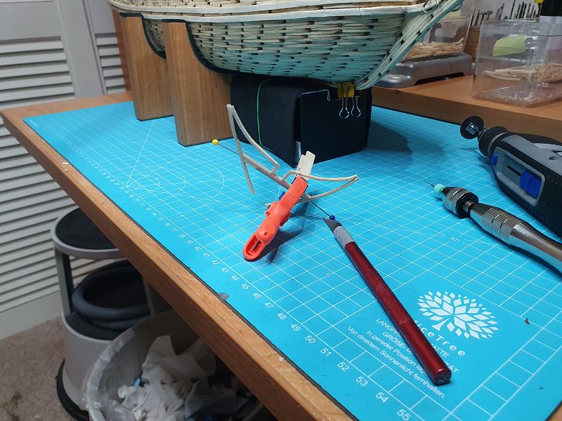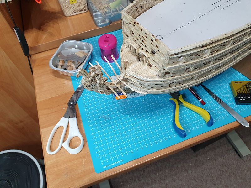 Das mit dem Gallionsgräting haut so nicht hin, zu zerbrechlich zu instabil. Die Balken lassen sich so nicht vernünftig befestigen und auch mit