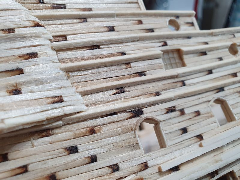 Zuerst kamen mir die Barkhölzer etwas zu gewaltig vor. Aber je länger ich es mir ansehe, umso mehr denke ich dass es passt. Schade ist das , nicht so schön wie beim Heller Modell, die Barkhölzer in die Lienen der Balkone übergehen. Aber es passte leider nicht da ich mich ja nach dem Gallion richten musste. Oder natürlich einer von euch hat eine Idee?