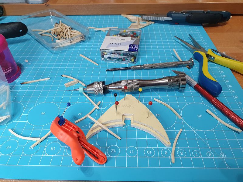 Von wegen Lustig. Das festspannen der Hölzer ist ein Krampf. Jede einzelne Lage Streichhölzer dauert ewig. Dagegen war der Rumpf, auch wenn ich